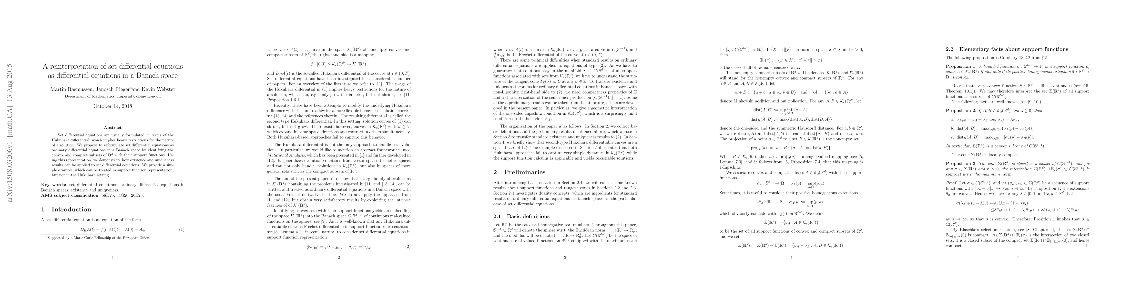 This paper reinterprets set differential equations by reformulating them as ordinary differential equations in a Banach space using support functions, offering a more flexible framework for existence and uniqueness results compared to the Hukuhara differential. An example is provided that illustrates the advantages of this new approach.
