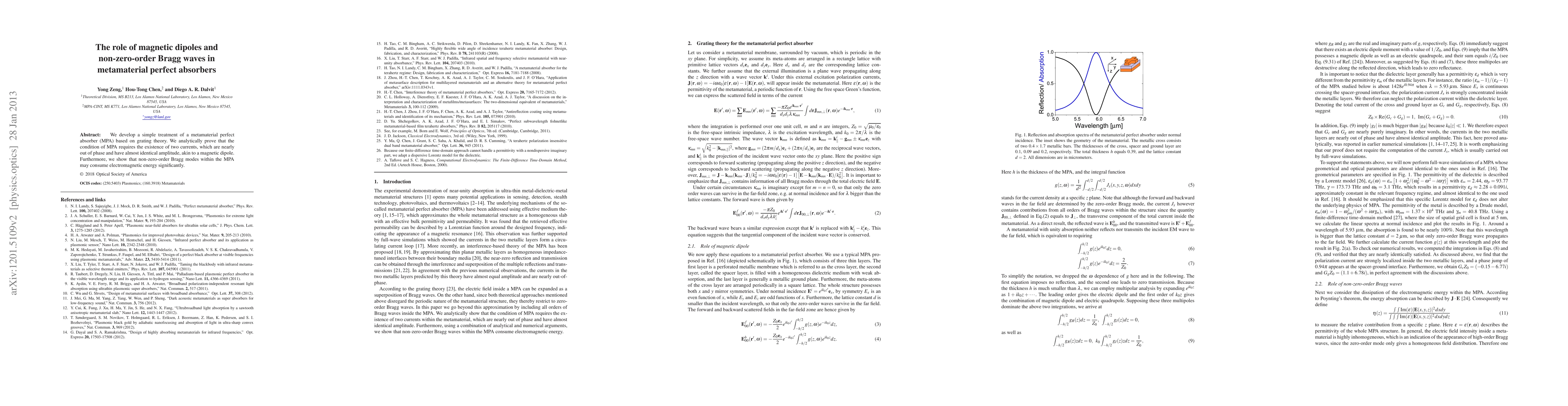 This paper reinterprets the metamaterial perfect absorber (MPA) using grating theory, proving that its condition necessitates two nearly out-of-phase currents with identical amplitude, similar to a magnetic dipole. It also demonstrates that non-zero-order Bragg modes within the MPA can substantially absorb electromagnetic energy.
