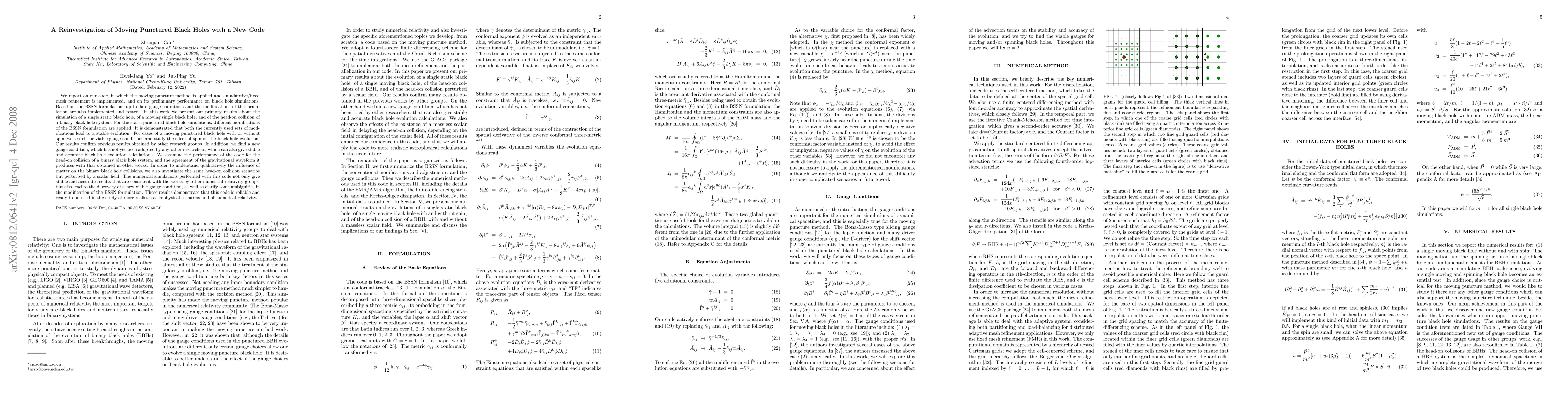 We report on our code, in which the moving puncture method is applied and an adaptive/fixed mesh refinement is implemented, and on its preliminary performance on black hole simulations. Based on the BSSN formulation, up-to-date gauge conditions and the modifications of the formulation are also implemented and tested. In this work we present our primary results about the simulation of a single static black hole, of a moving single black hole, and of the head-on collision of a binary black hole system. For the static punctured black hole simulations, different modifications of the BSSN formulation are applied. It is demonstrated that both the currently used sets of modifications lead to a stable evolution. For cases of a moving punctured black hole with or without spin, we search for viable gauge conditions and study the effect of spin on the black hole evolution. Our results confirm previous results obtained by other research groups. In addition, we find a new gauge condition, which has not yet been adopted by any other researchers, which can also give stable and accurate black hole evolution calculations. We examine the performance of the code for the head-on collision of a binary black hole system, and the agreement of the gravitational waveform it produces with that obtained in other works. In order to understand qualitatively the influence of matter on the binary black hole collisions, we also investigate the same head-on collision scenarios but perturbed by a scalar field. The numerical simulations performed with this code not only give stable and accurate results that are consistent with the works by other numerical relativity groups, but also lead to the discovery of a new viable gauge condition, as well as clarify some ambiguities in the modification of the BSSN formulation.
