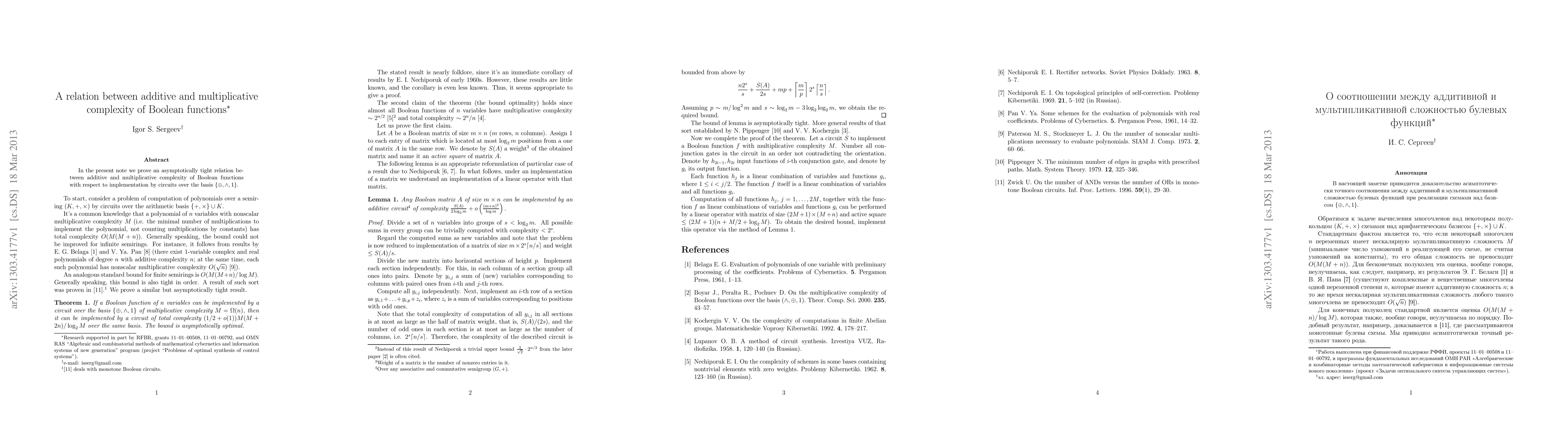 Summary: This paper establishes an asymptotically tight relationship between additive and multiplicative complexity for Boolean functions, demonstrating how they can be implemented using circuits based on the operations {+,*,1}. The findings provide a deeper understanding of the interplay between these two complexity measures.