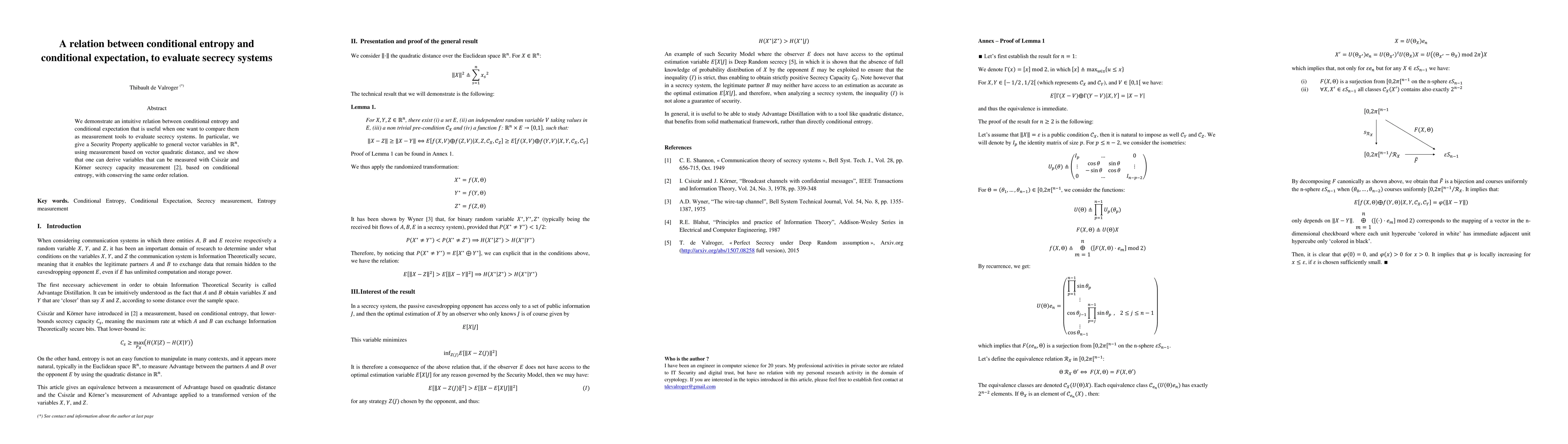 We demonstrate an intuitive relation between conditional entropy and conditional expectation that is useful when one want to compare them as measurement tools to evaluate secrecy systems. In particular, we give a Security Property applicable to general n-dimensional vector variables, using measurement based on vector quadratic distance, and we show that one can derive variables that can be measured with Csiszar and Korner secrecy capacity measurement, based on conditional entropy, with conserving the same order relation. V2: correction of a too approximative proof of Lemma.