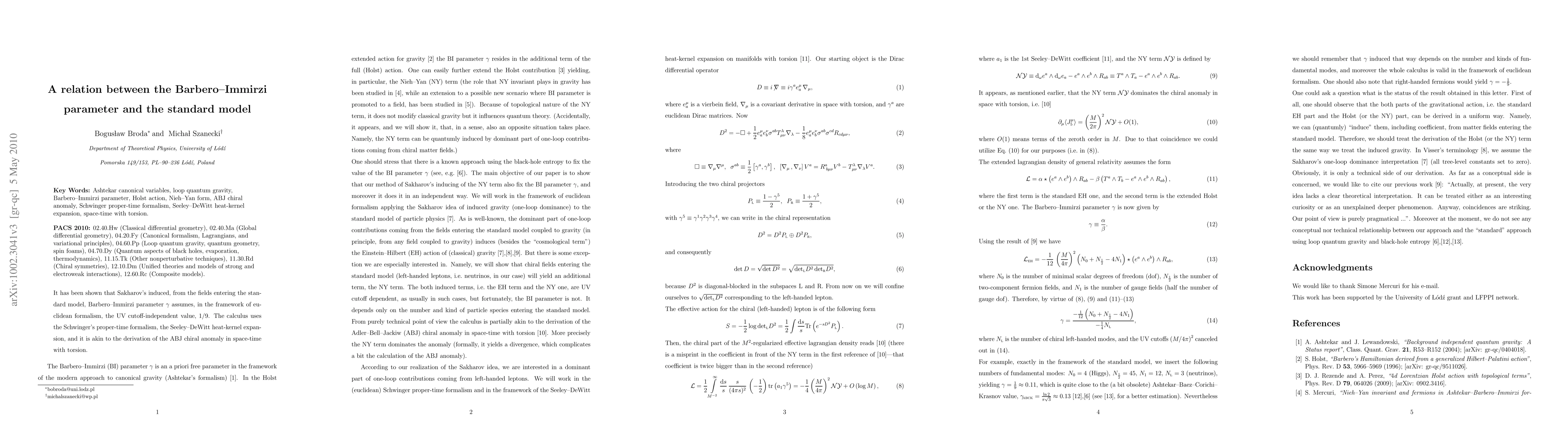 It has been shown that Sakharov's induced, from the fields entering the standard model, Barbero-Immirzi parameter assumes, in the framework of euclidean formalism, the UV cutoff-independent value, 1/9. The calculus uses the Schwinger's proper-time formalism, the Seeley-DeWitt heat-kernel expansion, and it is akin to the derivation of the ABJ chiral anomaly in space-time with torsion.