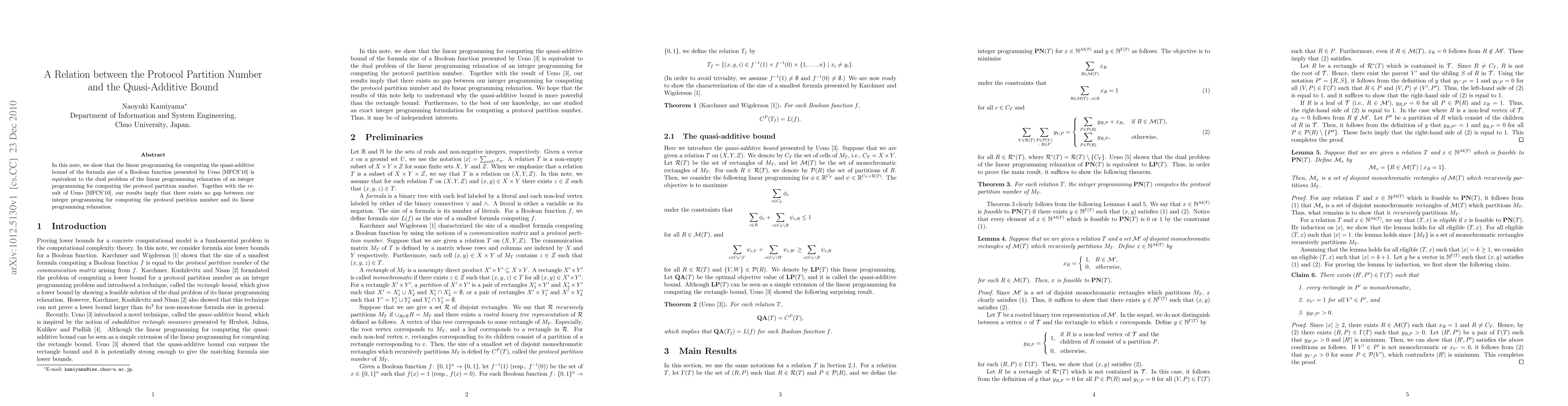 In this note, we show that the linear programming for computing the quasi-additive bound of the formula size of a Boolean function presented by Ueno [MFCS'10] is equivalent to the dual problem of the linear programming relaxation of an integer programming for computing the protocol partition number. Together with the result of Ueno [MFCS'10], our results imply that there exists no gap between our integer programming for computing the protocol partition number and its linear programming relaxation.