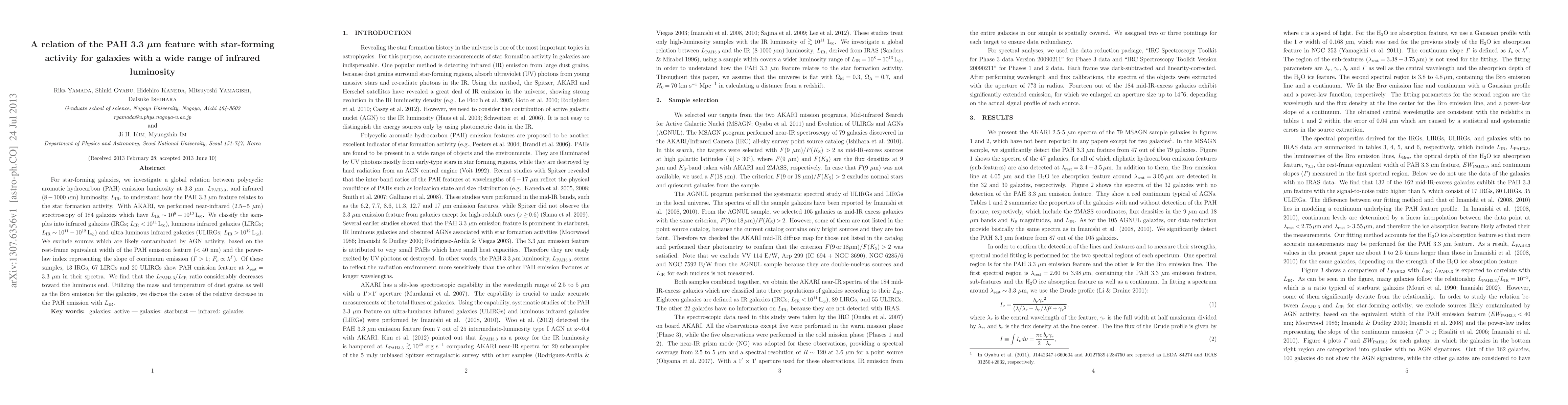 This study investigates the relationship between PAH emission at 3.3 µm and infrared luminosity in star-forming galaxies, finding a decreasing L_PAH3.3/L_IR ratio with increasing luminosity. The analysis, conducted using AKARI data on 184 galaxies, suggests that the PAH emission correlates with star formation activity but diminishes in more luminous galaxies.
