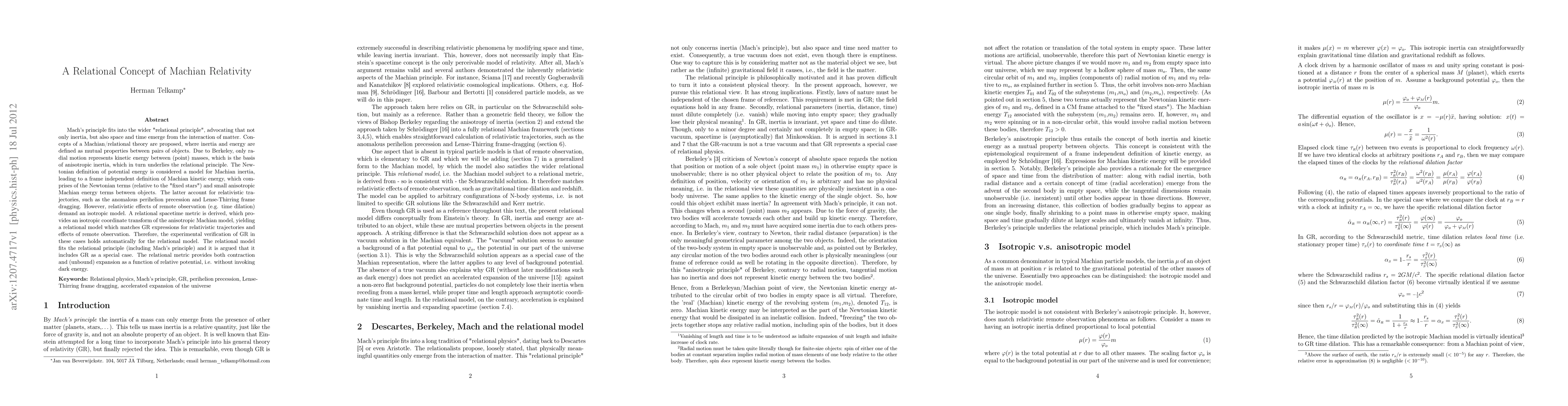 Mach's principle fits into the wider "relational principle", advocating that not only inertia, but also space and time emerge from the interaction of matter. Concepts of a Machian/relational theory are proposed, where inertia and energy are defined as mutual properties between pairs of objects. Due to Berkeley, only radial motion represents kinetic energy between (point) masses, which is the basis of anisotropic inertia, which in turn underlies the relational principle. The Newtonian definition of potential energy is considered a model for Machian inertia, leading to a frame independent definition of Machian kinetic energy, which comprises of the Newtonian terms (relative to the "fixed stars") and small anisotropic Machian energy terms between objects. The latter account for relativistic trajectories, such as the anomalous perihelion precession and Lense-Thirring frame dragging. However, relativistic effects of remote observation (e.g. time dilation) demand an isotropic model. A relational spacetime metric is derived, which provides an isotropic coordinate transform of the anisotropic Machian model, yielding a relational model which matches GR expressions for relativistic trajectories and effects of remote observation. Therefore, the experimental verification of GR in these cases holds automatically for the relational model. The relational model fits the relational principle (including Mach's principle) and it is argued that it includes GR as a special case. The relational metric provides both contraction and (unbound) expansion as a function of relative potential, i.e. without invoking dark energy.