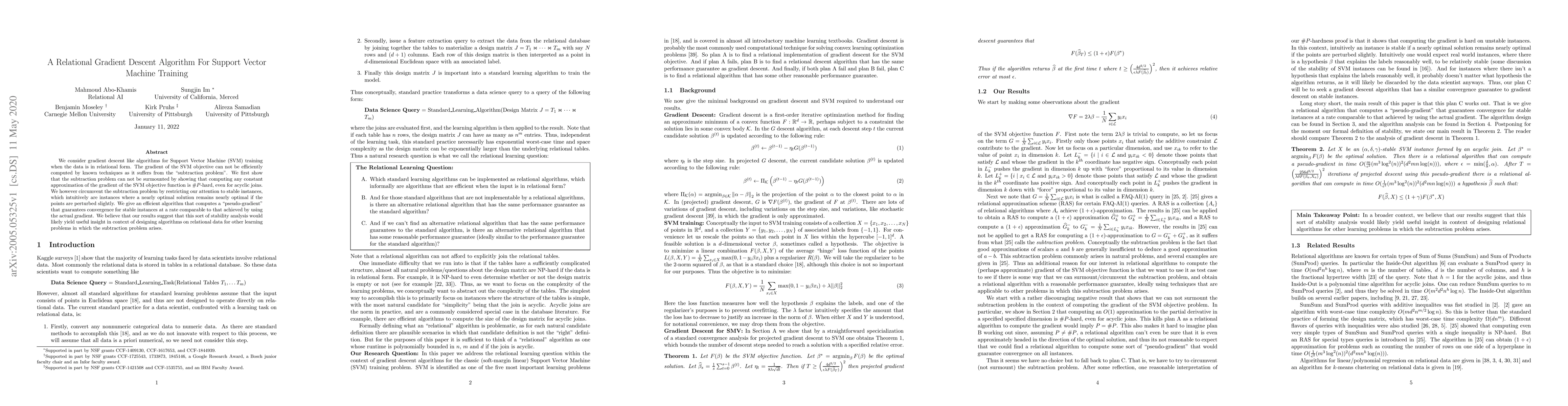 Researchers developed an algorithm to train Support Vector Machines on relational data without efficiently computing gradients, leveraging stability analysis to overcome the 'subtraction problem' for faster convergence. The approach offers a new perspective on designing algorithms for learning problems on relational data.