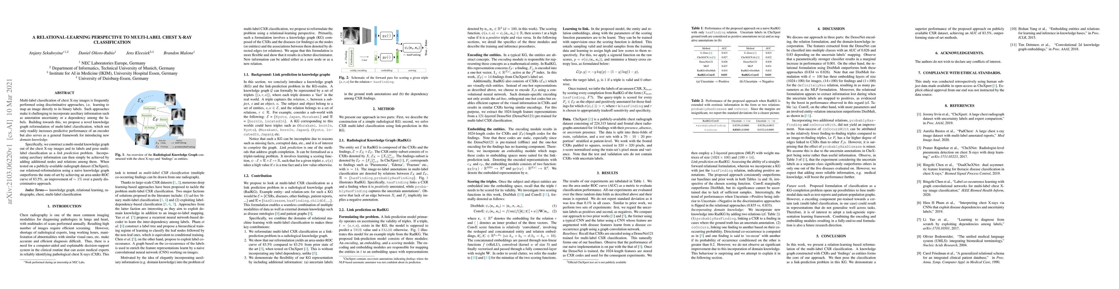This paper proposes a relational-learning approach to multi-label chest X-ray classification by reformulating it as a link prediction problem in a multi-modal knowledge graph. This method enhances predictive performance and allows for the incorporation of auxiliary information, outperforming state-of-the-art methods on the CheXpert dataset.