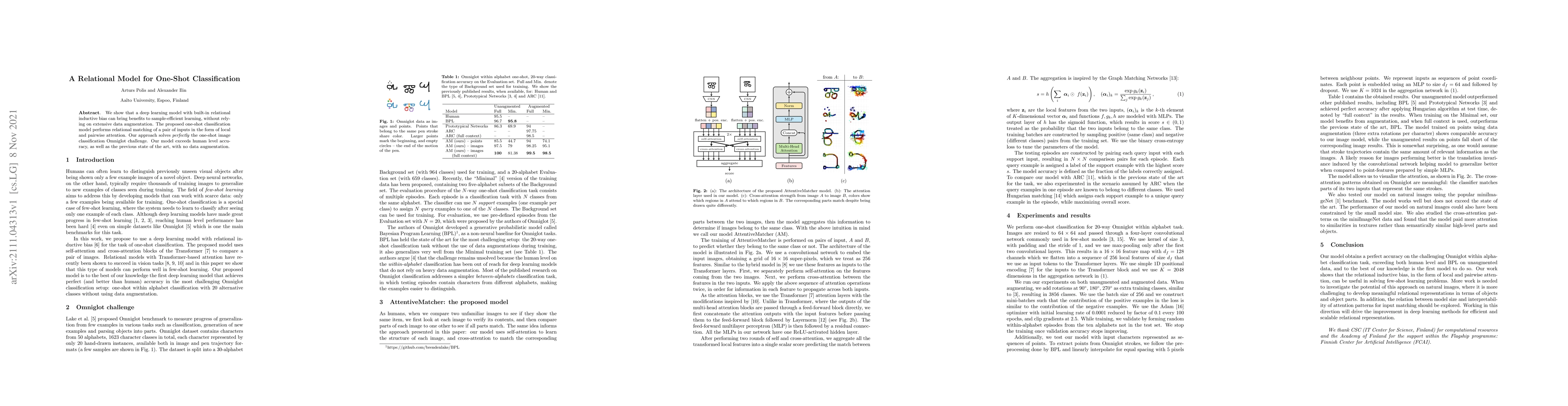 We show that a deep learning model with built-in relational inductive bias can bring benefits to sample-efficient learning, without relying on extensive data augmentation. The proposed one-shot classification model performs relational matching of a pair of inputs in the form of local and pairwise attention. Our approach solves perfectly the one-shot image classification Omniglot challenge. Our model exceeds human level accuracy, as well as the previous state of the art, with no data augmentation.