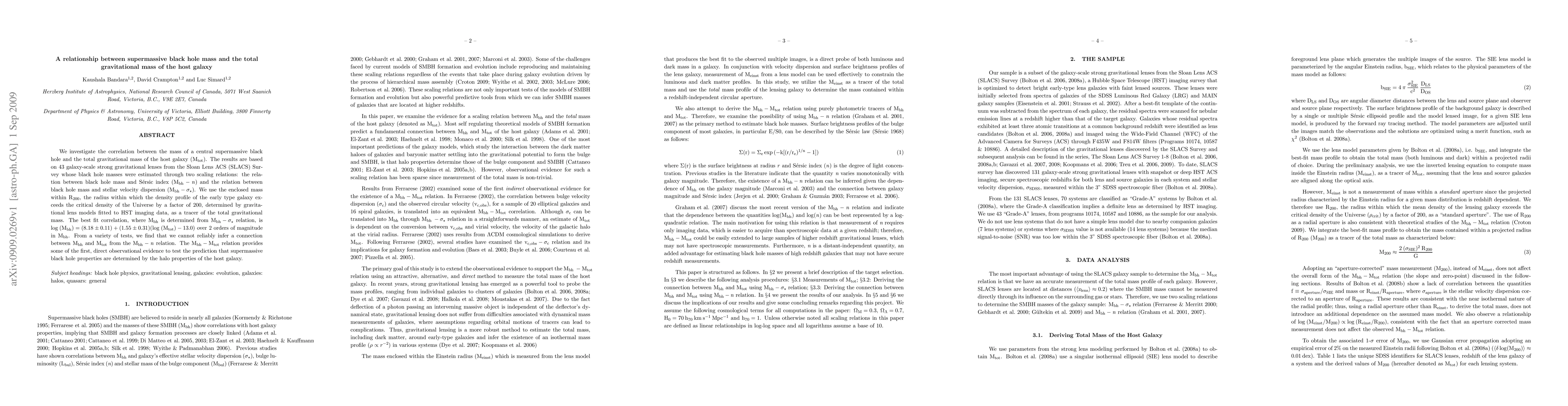 This study investigates the correlation between supermassive black hole mass and the total gravitational mass of host galaxies, using 43 strong gravitational lenses. The best fit relation shows a strong correlation, suggesting that black hole mass is determined by the host galaxy's gravitational mass, particularly via stellar velocity dispersion.