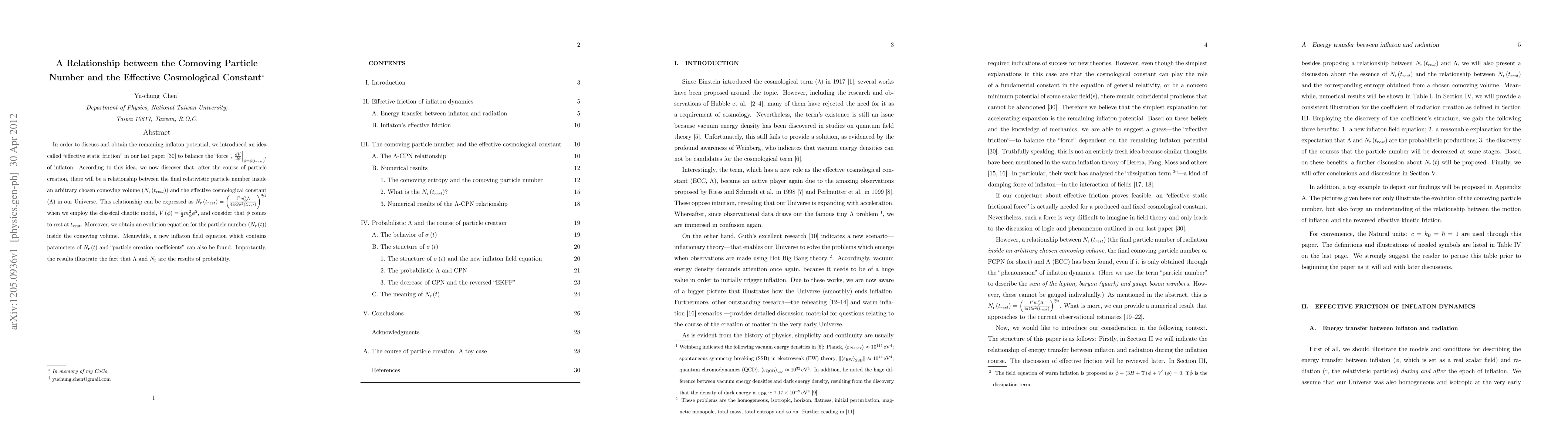 In order to discuss and obtain the remaining inflaton potential, we introduced an idea called "effective static friction" in our last paper to balance the "force", $\frac{dV}{d\phi}|_{\phi=\phi(t_{rest})}$, of inflaton. According to this idea, we now discover that, after the course of particle creation, there will be a relationship between the final relativistic particle number inside an arbitrary chosen comoving volume $N_r(t_{rest})$ and the effective cosmological constant $\Lambda$ in our Universe. This relationship can be expressed as $N_r(t_{rest})=(\frac{\ell^2m_\phi^2\Lambda}{4\pi G\sigma^2(t_{rest})})^{3/2}$ when we employ the classical chaotic model, $V(\phi)=1/2m_{\phi}^2\phi^2$, and consider that $\phi$ comes to rest at $t_{rest}$. Moreover, we obtain an evolution equation for the particle number ($N_r(t)$) inside the comoving volume. Meanwhile, a new inflaton field equation which contains parameters of $N_r(t)$ and "particle creation coefficients" can also be found. Importantly, the results illustrate the fact that $\Lambda$ and $N_r$ are the results of probability.