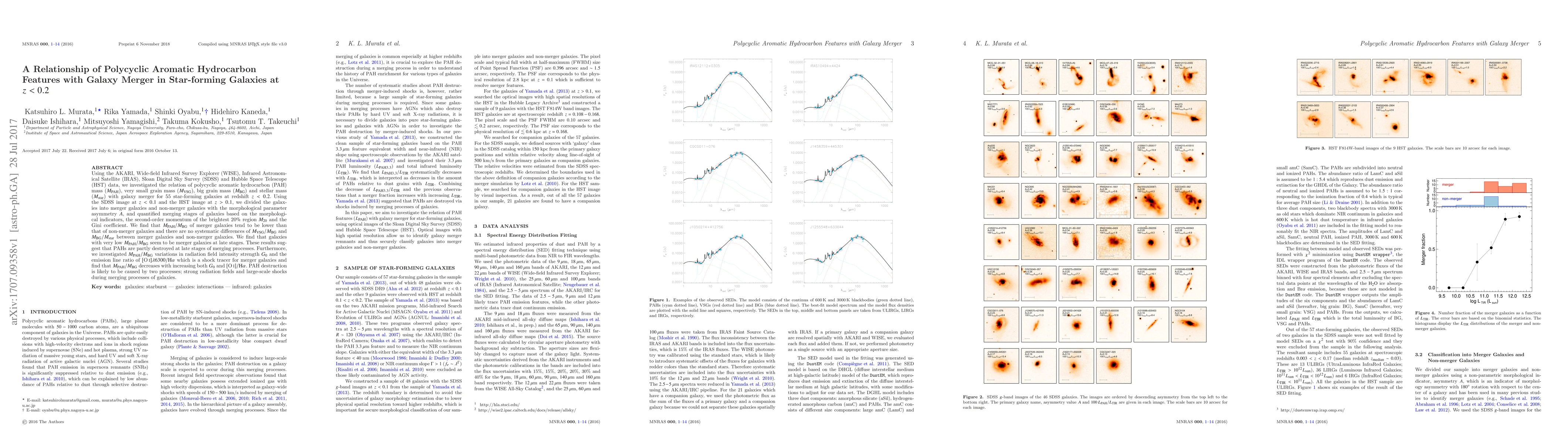 Using the AKARI, Wide-field Infrared Survey Explorer (WISE), Infrared Astronomical Satellite (IRAS), Sloan Digital Sky Survey (SDSS) and Hubble Space Telescope (HST) data, we investigated the relation of polycyclic aromatic hydrocarbon (PAH) mass ($M_{\rm PAH}$), very small grain mass ($M_{\rm VSG}$), big grain mass ($M_{\rm BG}$) and stellar mass ($M_{\rm star}$) with galaxy merger for 55 star-forming galaxies at redshift $z<0.2$. Using the SDSS image at $z<0.1$ and the HST image at $z>0.1$, we divided the galaxies into merger galaxies and non-merger galaxies with the morphological parameter asymmetry $A$, and quantified merging stages of galaxies based on the morphological indicators, the second-order momentum of the brightest 20$\%$ region $M_{20}$ and the Gini coefficient. We find that $M_{\rm PAH}/M_{\rm BG}$ of merger galaxies tend to be lower than that of non-merger galaxies and there are no systematic differences of $M_{\rm VSG}/M_{\rm BG}$ and $M_{\rm BG}/M_{\rm star}$ between merger galaxies and non-merger galaxies. We find that galaxies with very low $M_{\rm PAH}/M_{\rm BG}$ seem to be merger galaxies at late stages. These results suggest that PAHs are partly destroyed at late stages of merging processes. Furthermore, we investigated $M_{\rm PAH}/M_{\rm BG}$ variations in radiation field intensity strength $G_0$ and the emission line ratio of $[{\rm O\,{\scriptsize I}}]\lambda 6300/{\rm H}\alpha$ which is a shock tracer for merger galaxies and find that $M_{\rm PAH}/M_{\rm BG}$ decreases with increasing both $G_0$ and $[{\rm O\,{\scriptsize I}}]/{\rm H}\alpha$. PAH destruction is likely to be caused by two processes; strong radiation fields and large-scale shocks during merging processes of galaxies.