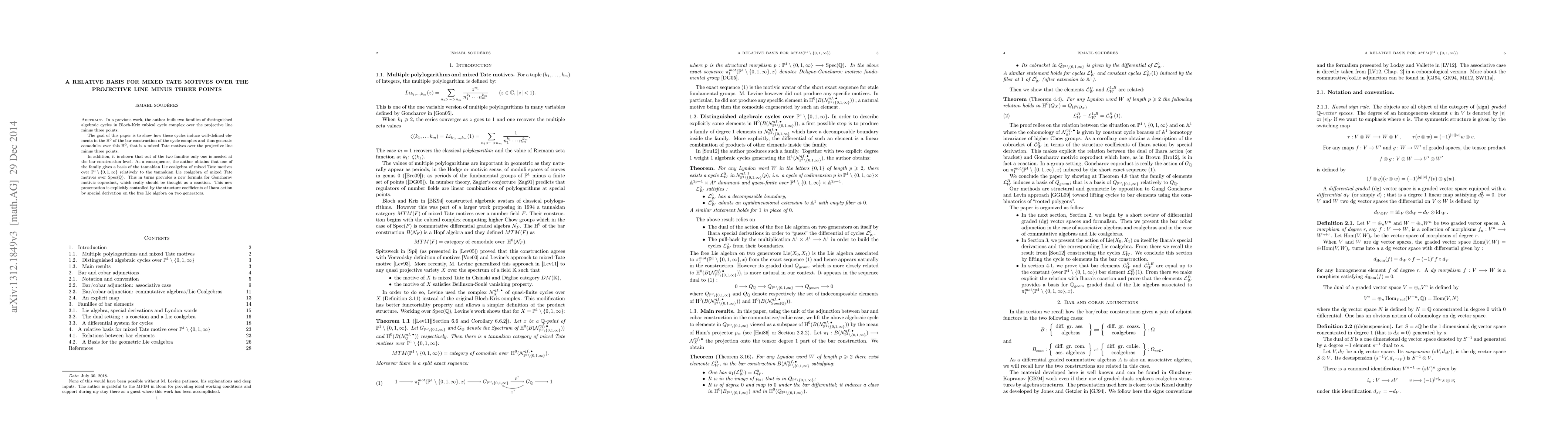 This paper constructs a relative basis for mixed Tate motives over the projective line minus three points using distinguished algebraic cycles, showing only one family is necessary. It establishes a basis for the Tannakian coLie coalgebra relative to a standard reference, leading to a new formula for Goncharov's motivic coproduct.