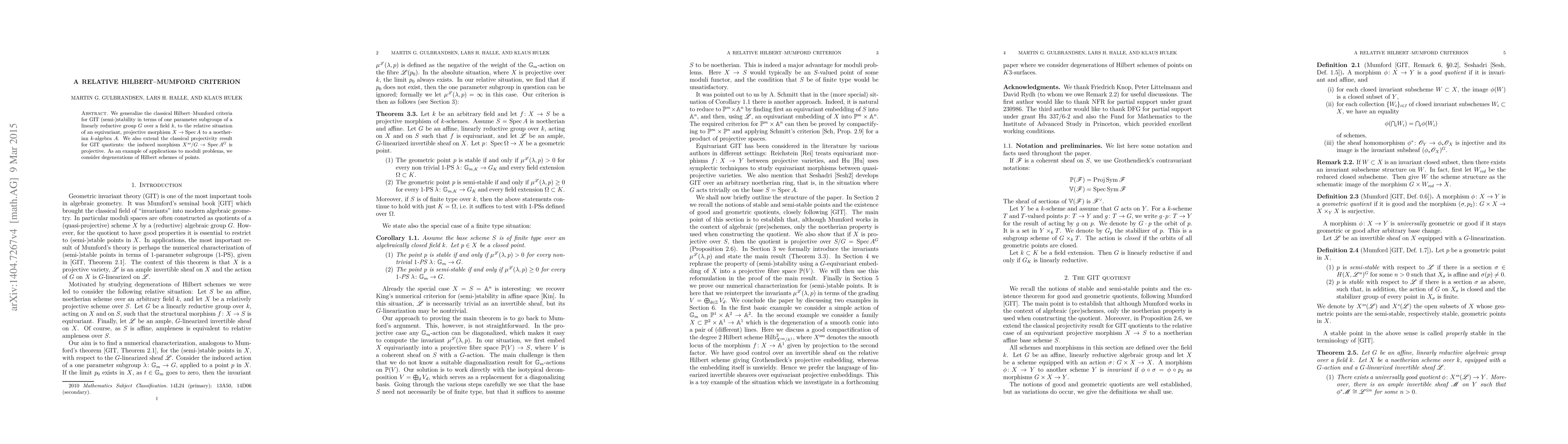 This paper generalizes the Hilbert-Mumford criterion for GIT stability to relative settings, applying it to equivariant projective morphisms over noetherian algebras, and extends the projectivity of GIT quotients. It also demonstrates applications to the degeneration of Hilbert schemes of points.