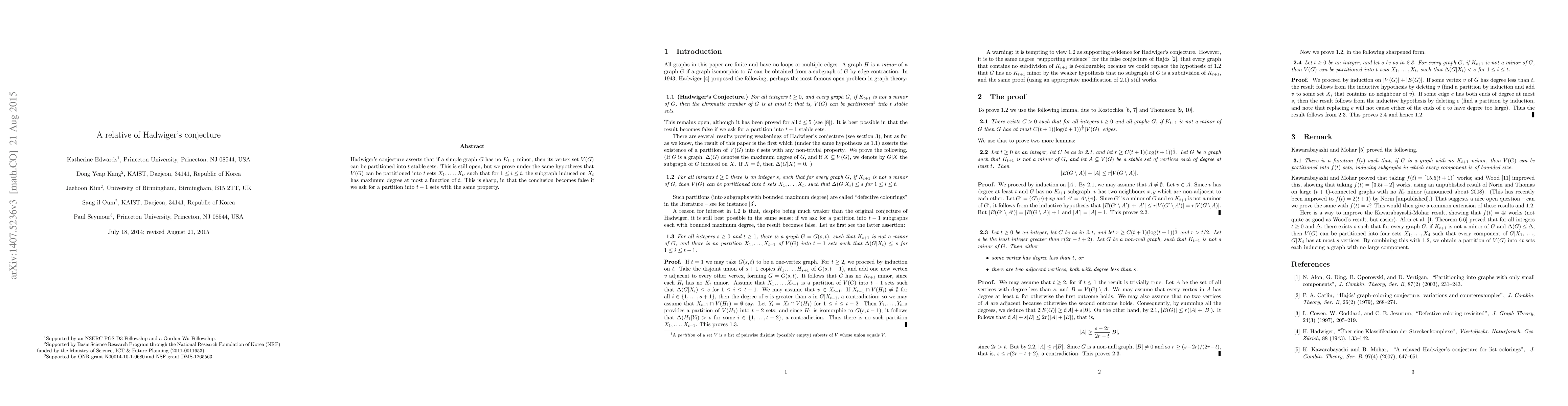 Researchers prove that if a simple graph has no K_{t+1} minor, its vertices can be partitioned into t sets with maximum degree at most a function of t.