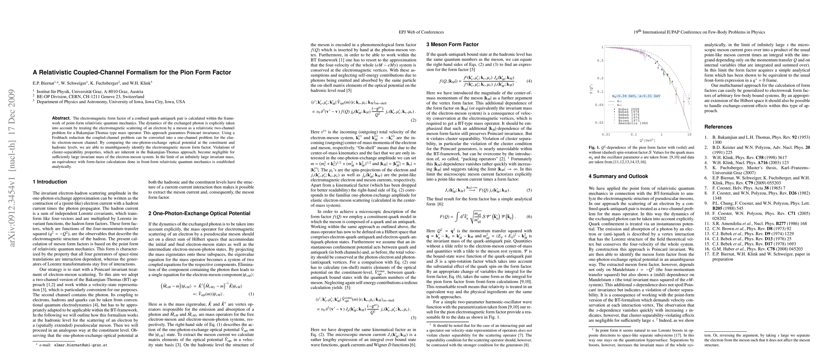 This paper develops a relativistic coupled-channel formalism to calculate the pion form factor using point-form relativistic quantum mechanics, ensuring Poincare invariance. It identifies the electromagnetic meson form factor by comparing constituent and hadronic levels, demonstrating negligible violations of cluster-separability for large invariant masses.