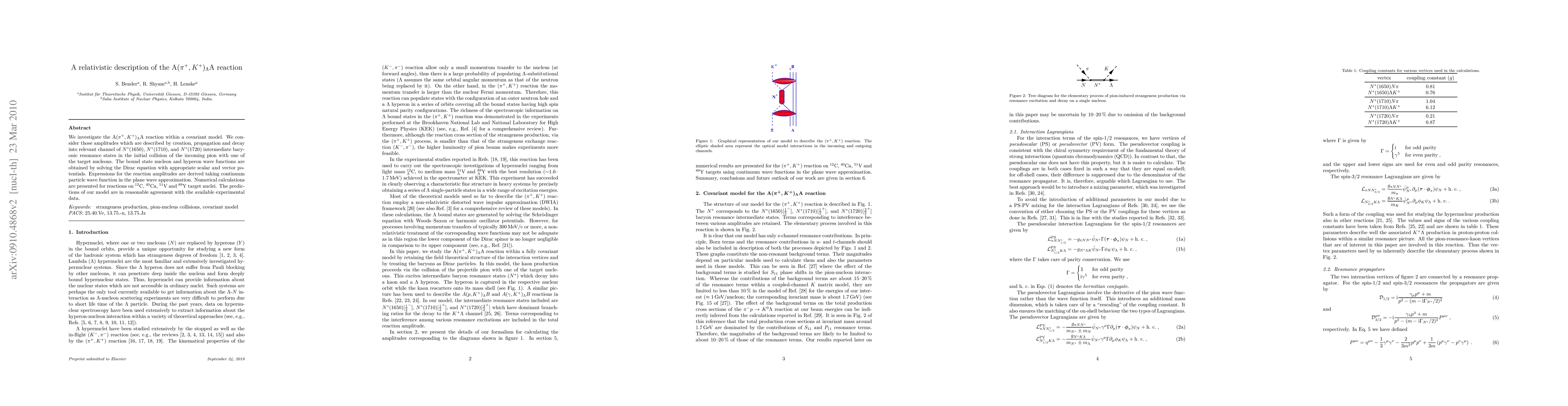 We investigate the A$(\pi^+,K^+){_\Lambda}$A reaction within a covariant model. We consider those amplitudes which are described by creation, propagation and decay into relevant channel of $N^*$(1650), $N^*$(1710), and $N^*$(1720) intermediate baryonic resonance states in the initial collision of the incoming pion with one of the target nucleons. The bound state nucleon and hyperon wave functions are obtained by solving the Dirac equation with appropriate scalar and vector potentials. Expressions for the reaction amplitudes are derived taking continuum particle wave function in the plane wave approximation. Numerical calculations are presented for reactions on $^{12}$C, $^{40}$Ca, $^{51}$V and $^{89}$Y target nuclei. The predictions of our model are in reasonable agreement with the available experimental data.