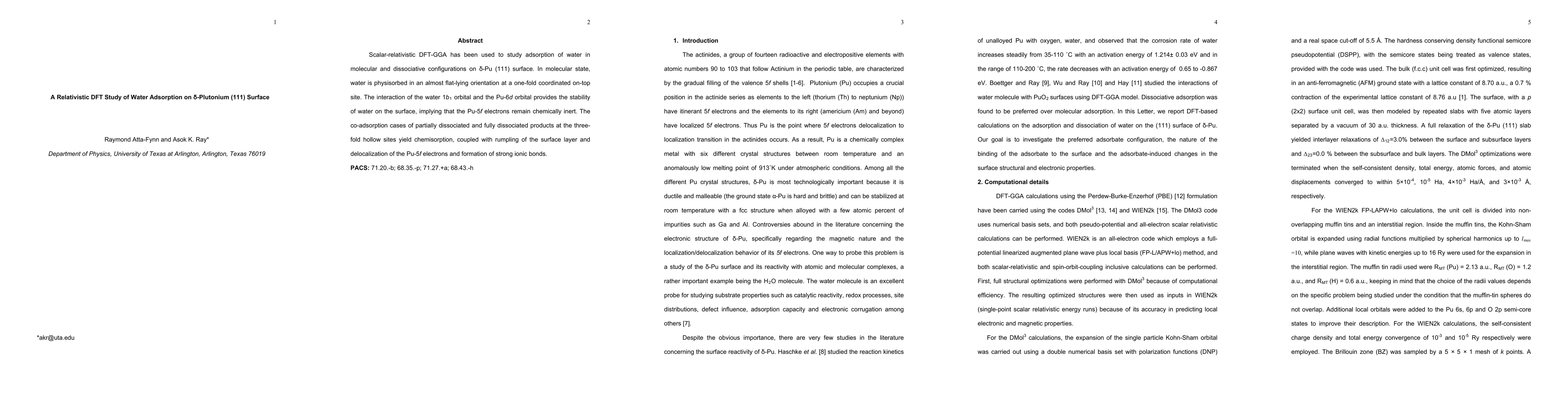 Scalar-relativistic DFT-GGA has been used to study adsorption of water in molecular and dissociative configurations on delta-Plutonium (111) surface. In molecular state, water is physisorbed in an almost flat-lying orientation at a one-fold coordinated on-top site. The interaction of the water 1b1 orbital and the Pu-6d orbital provides the stability of water on the surface, implying that the Pu-5f electrons remain chemically inert. The co-adsorption cases of partially dissociated and fully dissociated products at the three-fold hollow sites yield chemisorption, coupled with rumpling of the surface layer and delocalization of the Pu-5f electrons and formation of strong ionic bonds.