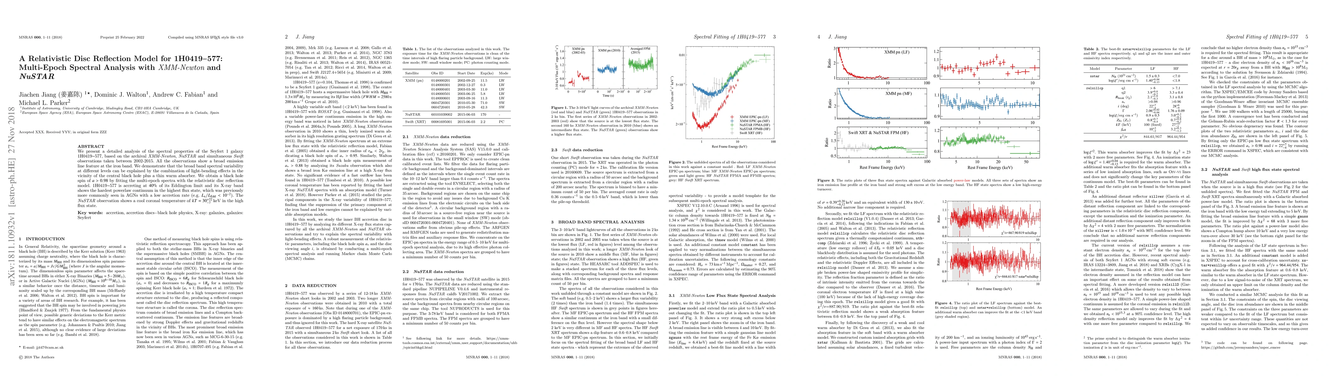 This study analyzes the Seyfert 1 galaxy 1H0419-577 using XMM-Newton, NuSTAR, and Swift data from 2002-2015. The research reveals that the galaxy's broad band spectral variability can be explained by relativistic disc reflection and a thin warm absorber, with a black hole spin greater than 0.98. The galaxy is found to be accreting at 40% of its Eddington limit, displaying a hard powerlaw continuum typically seen in lower accretion rate AGNs. The NuSTAR observation indicates a cool coronal temperature in high flux states.