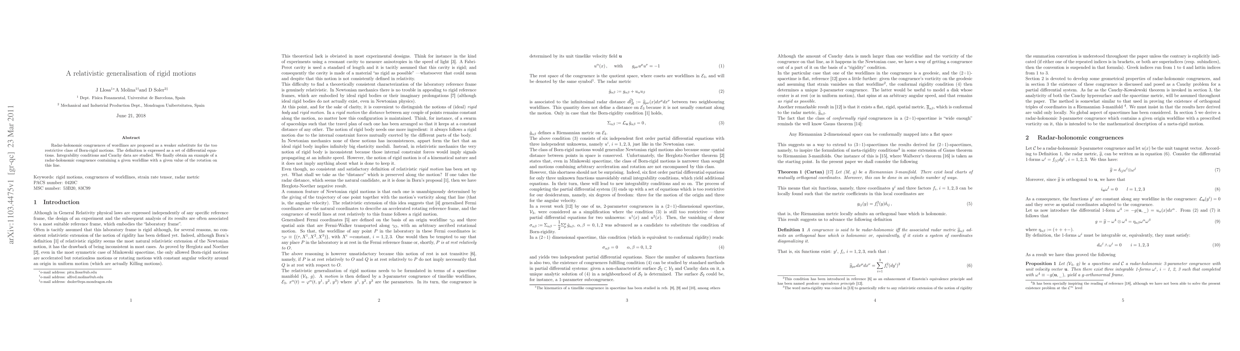 Radar-holonomic congruences of wordlines are proposed as a weaker substitute for the too restrictive class of Born-rigid motions. The definition is expressed as a set of differential equations. Integrability conditions and Cauchy data are studied. We finally obtain an example of a radar-holonomic congruence containing a given worldline with a given value of the rotation on this line.
