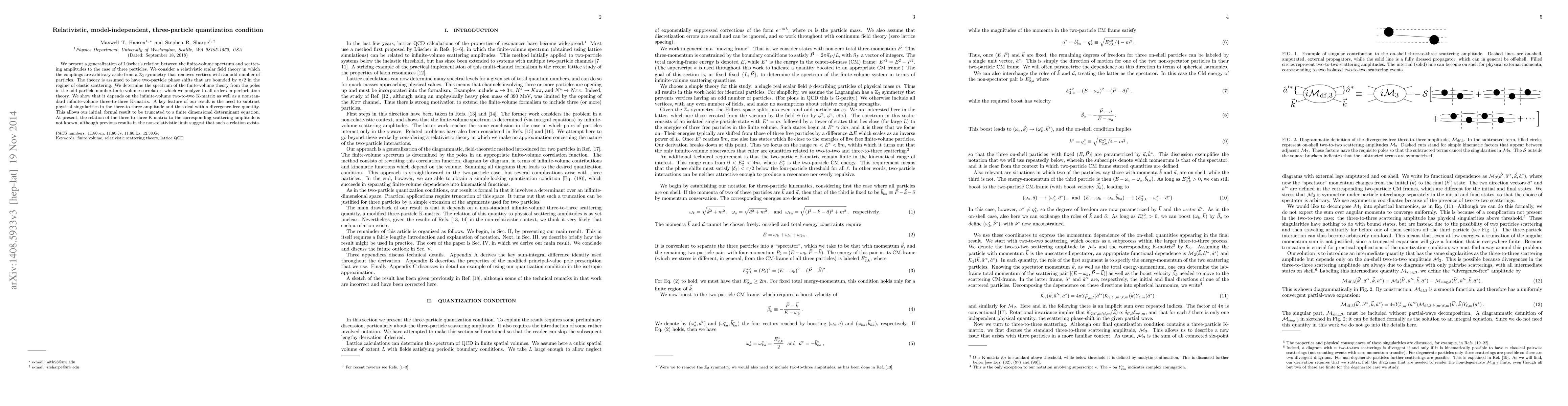 We present a generalization of Luescher's relation between the finite-volume spectrum and scattering amplitudes to the case of three particles. We consider a relativistic scalar field theory in which the couplings are arbitrary aside from a Z2 symmetry that removes vertices with an odd number of particles. The theory is assumed to have two-particle phase shifts that are bounded by \pi/2 in the regime of elastic scattering. We determine the spectrum of the finite-volume theory from the poles in the odd-particle-number finite-volume correlator, which we analyze to all orders in perturbation theory. We show that it depends on the infinite-volume two-to-two K-matrix as well as a nonstandard infinite-volume three-to-three K-matrix. A key feature of our result is the need to subtract physical singularities in the three-to-three amplitude and thus deal with a divergence-free quantity. This allows our initial, formal result to be truncated to a finite dimensional determinant equation. At present, the relation of the three-to-three K-matrix to the corresponding scattering amplitude is not known, although previous results in the non-relativistic limit suggest that such a relation exists.