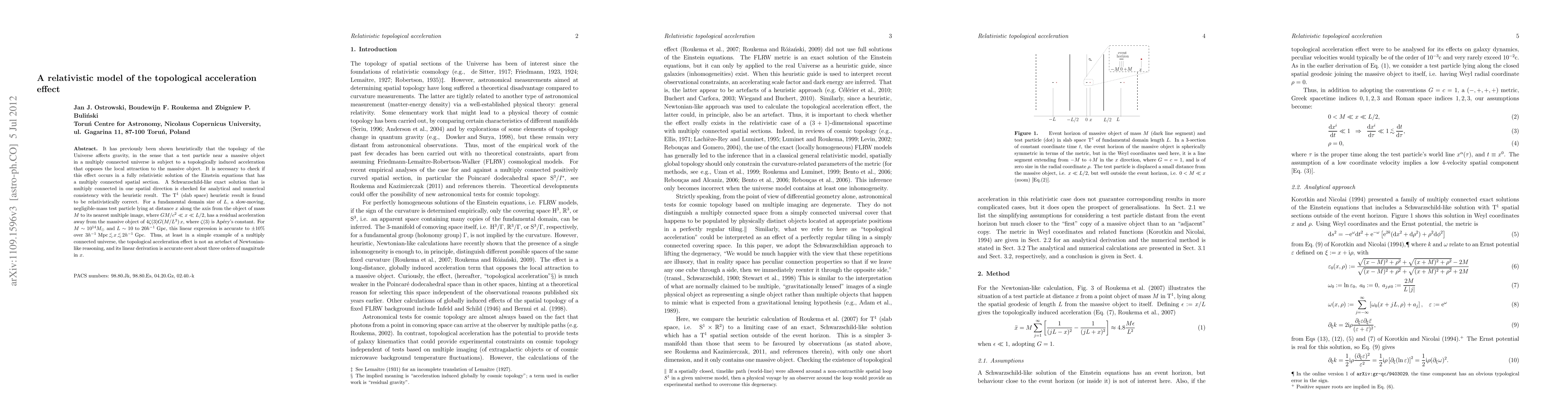It has previously been shown heuristically that the topology of the Universe affects gravity, in the sense that a test particle near a massive object in a multiply connected universe is subject to a topologically induced acceleration that opposes the local attraction to the massive object. This effect distinguishes different comoving 3-manifolds, potentially providing a theoretical justification for the Poincar\'e dodecahedral space observational hypothesis and a dynamical test for cosmic topology. It is necessary to check if this effect occurs in a fully relativistic solution of the Einstein equations that has a multiply connected spatial section. A Schwarzschild-like exact solution that is multiply connected in one spatial direction is checked for analytical and numerical consistency with the heuristic result. The T$^1$ (slab space) heuristic result is found to be relativistically correct. For a fundamental domain size of $L$, a slow-moving, negligible-mass test particle lying at distance $x$ along the axis from the object of mass $M$ to its nearest multiple image, where $GM/c^2 \ll x \ll L/2$, has a residual acceleration away from the massive object of $4\zeta(3) G(M/L^3)\,x$, where $\zeta(3)$ is Ap\'ery's constant. For $M \sim 10^14 M_\odot$ and $L \sim 10$ to $20\hGpc$, this linear expression is accurate to $\pm10%$ over $3\hMpc \ltapprox x \ltapprox 2\hGpc$. Thus, at least in a simple example of a multiply connected universe, the topological acceleration effect is not an artefact of Newtonian-like reasoning, and its linear derivation is accurate over about three orders of magnitude in $x$.