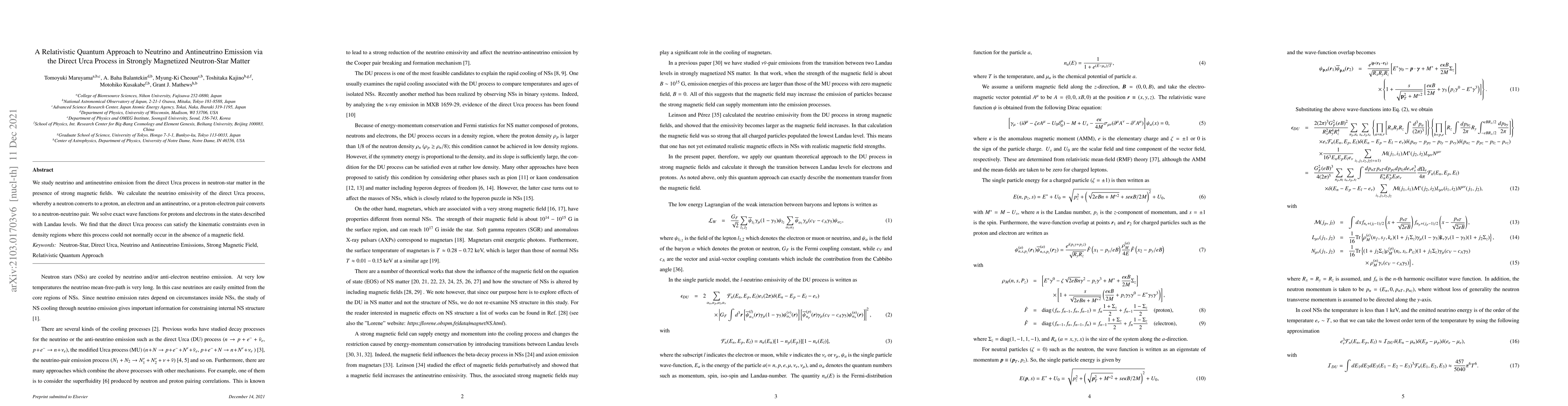 This paper investigates neutrino and antineutrino emissions from the direct Urca process in neutron-star matter under strong magnetic fields, finding that magnetic fields enable the process in denser regions where it typically fails. Exact wave functions for protons and electrons in Landau levels are used to calculate the neutrino emissivity.