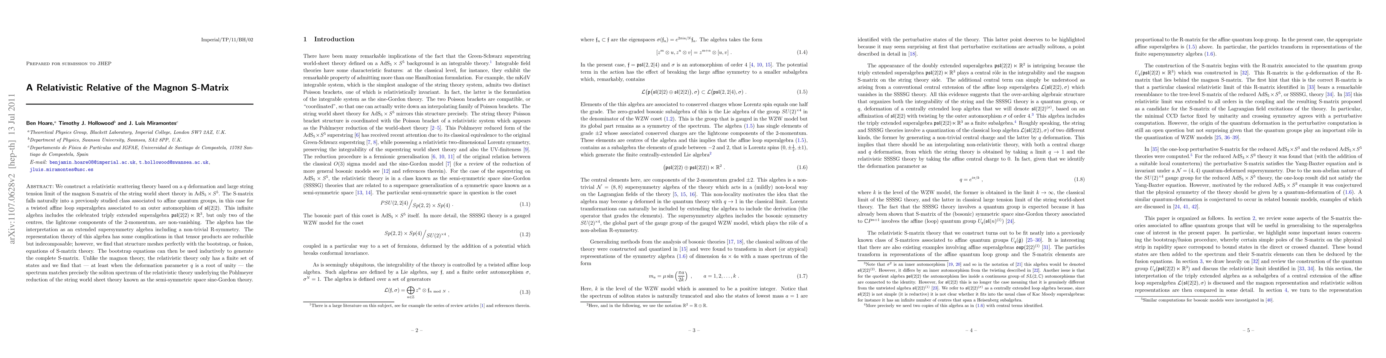 We construct a relativistic scattering theory based on a q deformation and large string tension limit of the magnon S-matrix of the string world sheet theory in AdS_5 x S^5. The S-matrix falls naturally into a previously studied class associated to affine quantum groups, in this case for a twisted affine loop superalgebra associated to an outer automorphism of sl(2|2). This infinite algebra includes the celebrated triply extended psl(2|2) x R^3 algebra, but only two of the centres, the lightcone components of the 2-momentum, are non-vanishing. The algebra has the interpretation as an extended supersymmetry algebra including a non-trivial R-symmetry. The representation theory of this algebra has some complications in that tensor products are reducible but indecomposable, however, we find that structure meshes perfectly with the bootstrap, or fusion, equations of S-matrix theory. The bootstrap equations can then be used inductively to generate the complete S-matrix. Unlike the magnon theory, the relativistic theory only has a finite set of states and we find that - at least when the deformation parameter q is a root of unity - the spectrum matches precisely the soliton spectrum of the relativistic theory underlying the Pohlmeyer reduction of the string world sheet theory known as the semi-symmetric space sine-Gordon theory.