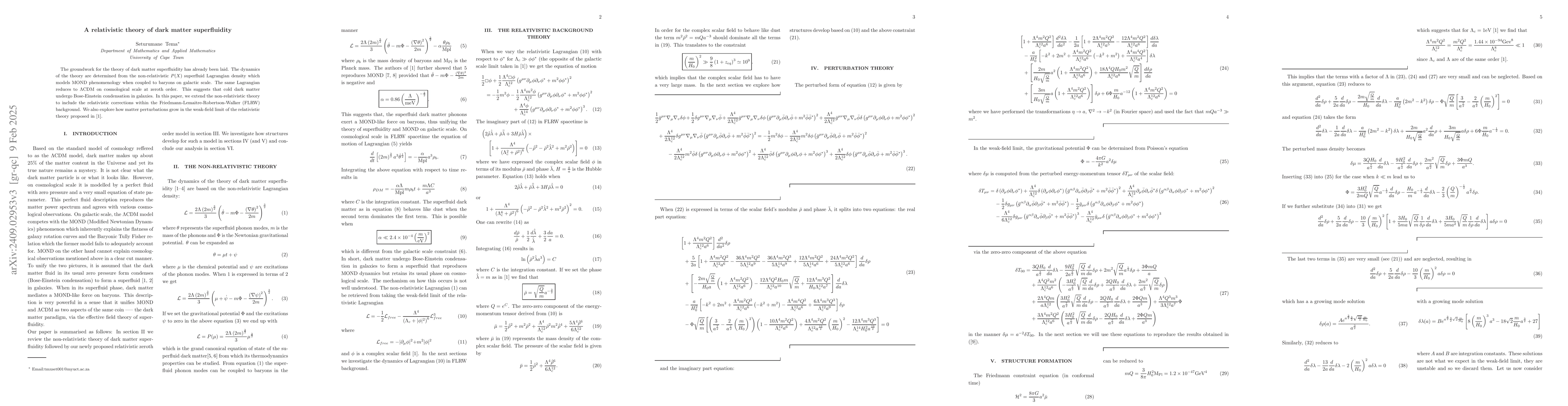 Summary: This paper presents an extended theory of dark matter superfluidity, incorporating relativistic corrections to enhance the understanding of dark matter behavior. The work aims to provide a more accurate model for the dynamics of dark matter superfluids.