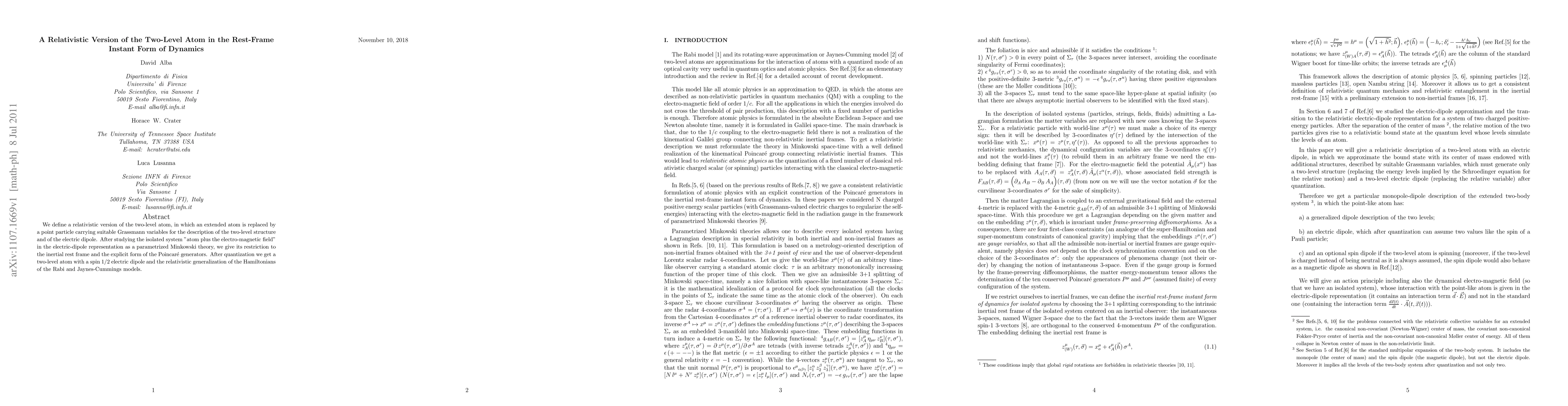 We define a relativistic version of the two-level atom, in which an extended atom is replaced by a point particle carrying suitable Grassmann variables for the description of the two-level structure and of the electric dipole. After studying the isolated system "atom plus the electro-magnetic field" in the electric-dipole representation as a parametrized Minkowski theory, we give its restriction to the inertial rest frame and the explicit form of the Poincar\'e generators. After quantization we get a two-level atom with a spin 1/2 electric dipole and the relativistic generalization of the Hamiltonians of the Rabi and Jaynes-Cummings models.