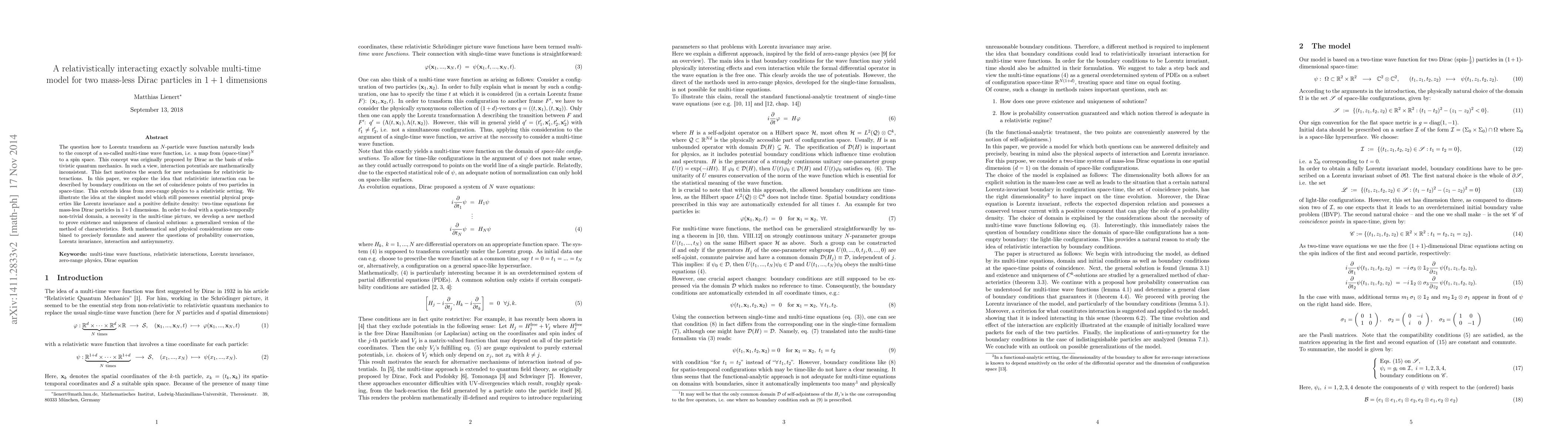 The question how to Lorentz transform an N-particle wave function naturally leads to the concept of a so-called multi-time wave function, i.e. a map from (space-time)^N to a spin space. This concept was originally proposed by Dirac as the basis of relativistic quantum mechanics. In such a view, interaction potentials are mathematically inconsistent. This fact motivates the search for new mechanisms for relativistic interactions. In this paper, we explore the idea that relativistic interaction can be described by boundary conditions on the set of coincidence points of two particles in space-time. This extends ideas from zero-range physics to a relativistic setting. We illustrate the idea at the simplest model which still possesses essential physical properties like Lorentz invariance and a positive definite density: two-time equations for mass-less Dirac particles in 1+1 dimensions. In order to deal with a spatio-temporally non-trivial domain, a necessity in the multi-time picture, we develop a new method to prove existence and uniqueness of classical solutions: a generalized version of the method of characteristics. Both mathematical and physical considerations are combined to precisely formulate and answer the questions of probability conservation, Lorentz invariance, interaction and antisymmetry.