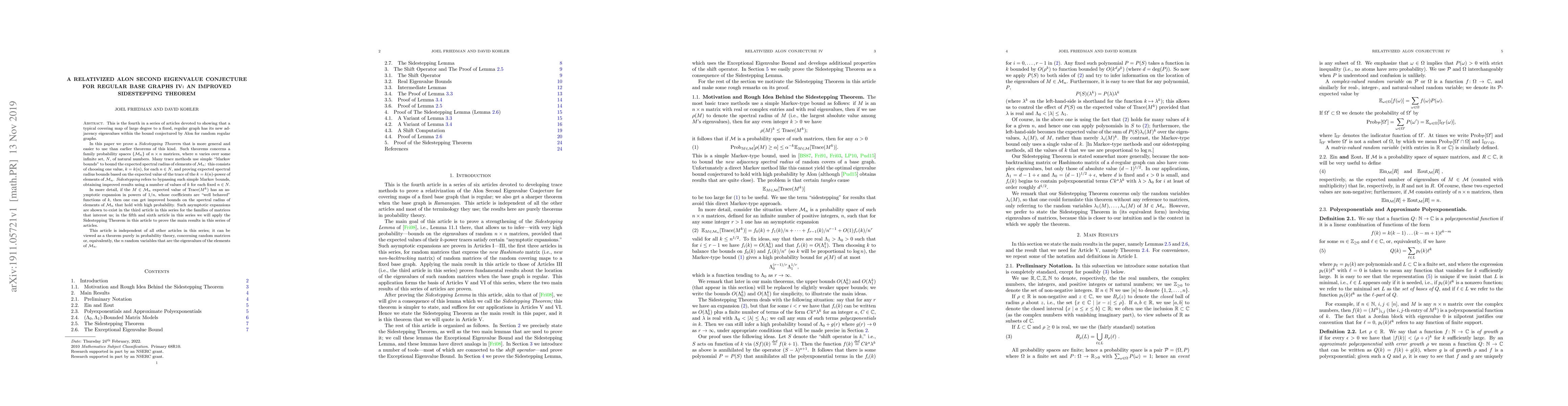 This is the fourth in a series of articles devoted to showing that a typical covering map of large degree to a fixed, regular graph has its new adjacency eigenvalues within the bound conjectured by Alon for random regular graphs. In this paper we prove a {\em Sidestepping Theorem} that is more general and easier to use than earlier theorems of this kind. Such theorems concerns a family probability spaces $\{{\mathcal{M}}_n\}$ of $n\times n$ matrices, where $n$ varies over some infinite set, $N$, of natural numbers. Many trace methods use simple "Markov bounds" to bound the expected spectral radius of elements of ${\mathcal{M}}_n$: this consists of choosing one value, $k=k(n)$, for each $n\in N$, and proving expected spectral radius bounds based on the expected value of the trace of the $k=k(n)$-power of elements of ${\mathcal{M}}_n$. {\em Sidestepping} refers to bypassing such simple Markov bounds, obtaining improved results using a number of values of $k$ for each fixed $n\in N$. In more detail, if the $M\in {\mathcal{M}}_n$ expected value of ${\rm Trace}(M^k)$ has an asymptotic expansion in powers of $1/n$, whose coefficients are "well behaved" functions of $k$, then one can get improved bounds on the spectral radius of elements of ${\mathcal{M}}_n$ that hold with high probability. Such asymptotic expansions are shown to exist in the third article in this series for the families of matrices that interest us; in the fifth and sixth article in this series we will apply the Sidestepping Theorem in this article to prove the main results in this series of articles. This article is independent of all other articles in this series; it can be viewed as a theorem purely in probability theory, concerning random matrices or, equivalently, the $n$ random variables that are the eigenvalues of the elements of ${\mathcal{M}}_n$.