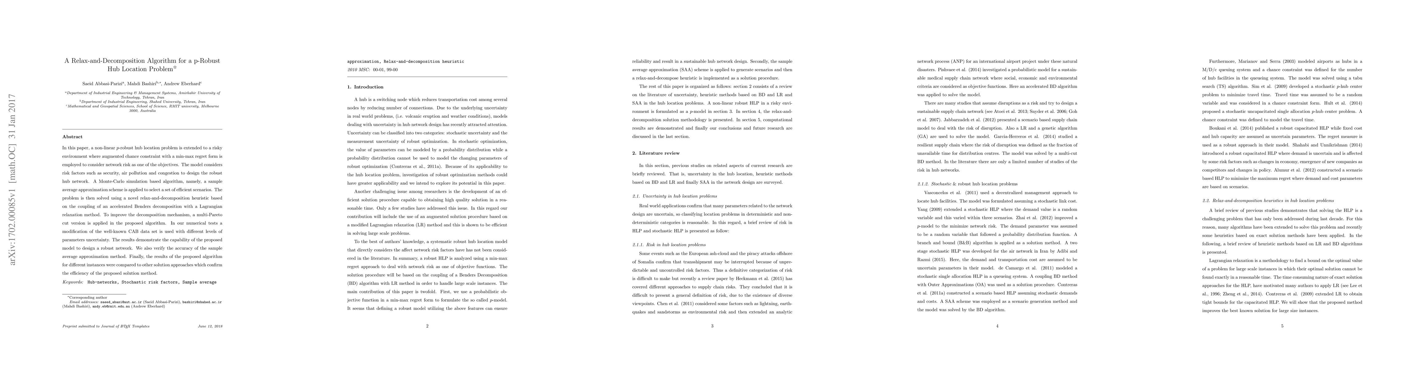 In this paper, a non-linear p-robust hub location problem is extended to a risky environment where augmented chance constraint with a min-max regret form is employed to consider network risk as one of the objectives. The model considers risk factors such as security, air pollution and congestion to design the robust hub network. A Monte-Carlo simulation based algorithm, namely, a sample average approximation scheme is applied to select a set of efficient scenarios. The problem is then solved using a novel relax-and-decomposition heuristic based on the coupling of an accelerated Benders decomposition with a Lagrangian relaxation method. To improve the decomposition mechanism, a multi-Pareto cut version is applied in the proposed algorithm. In our numerical tests a modification of the well-known CAB data set is used with different levels of parameters uncertainty. The results demonstrate the capability of the proposed model to design a robust network. We also verify the accuracy of the sample average approximation method. Finally, the results of the proposed algorithm for different instances were compared to other solution approaches which confirm the efficiency of the proposed solution method.