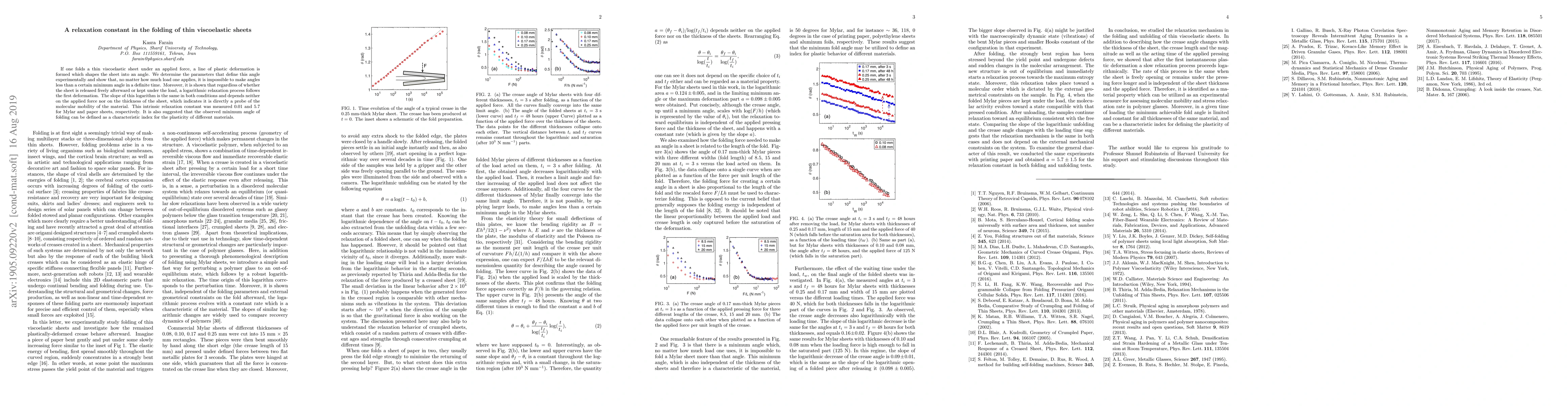 If one folds a thin viscoelastic sheet under an applied force, a line of plastic deformation is formed which shapes the sheet into an angle. We determine the parameters that define this angle experimentally and show that, no matter how much load one applies, it is impossible to make angles less than a certain minimum angle in a definite time. Moreover, it is shown that regardless of whether the sheet is released freely afterward or kept under the load, a logarithmic relaxation process follows the first deformation. The slope of this logarithm is the same in both conditions and depends neither on the applied force nor on the thickness of the sheet, which indicates it is directly a probe of the molecular mobility of the material. This intrinsic relaxation constant was measured 0.01 and 5.7 for Mylar and paper sheets, respectively. It is also suggested that the observed minimum angle of folding can be defined as a characteristic index for the plasticity of different materials.