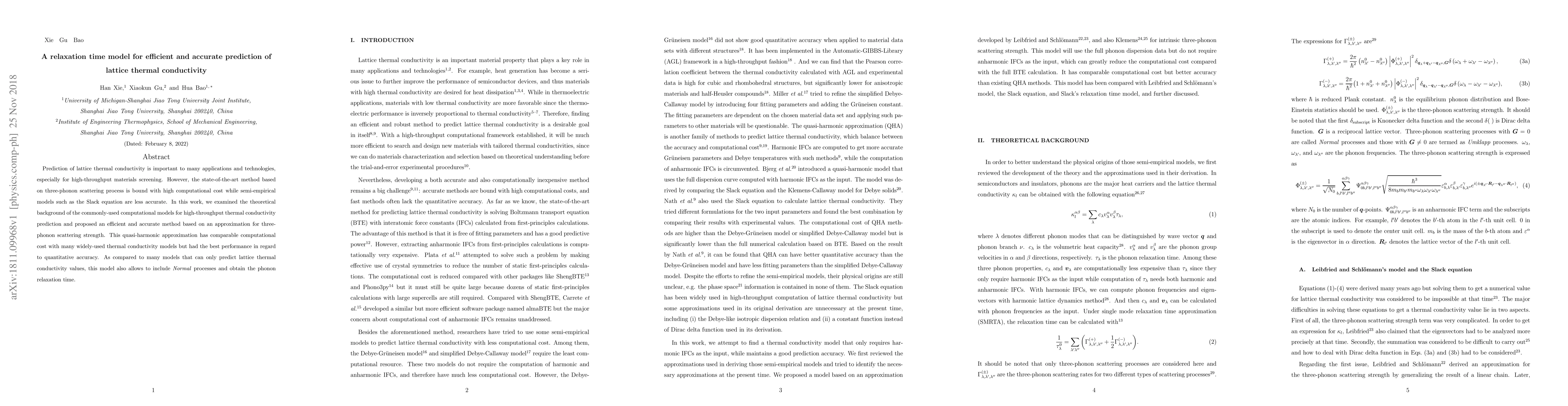 This paper proposes an efficient relaxation time model for predicting lattice thermal conductivity, balancing computational cost and accuracy. Unlike traditional methods, it incorporates a quasi-harmonic approximation for three-phonon scattering, offering improved quantitative accuracy and the ability to determine phonon relaxation times.