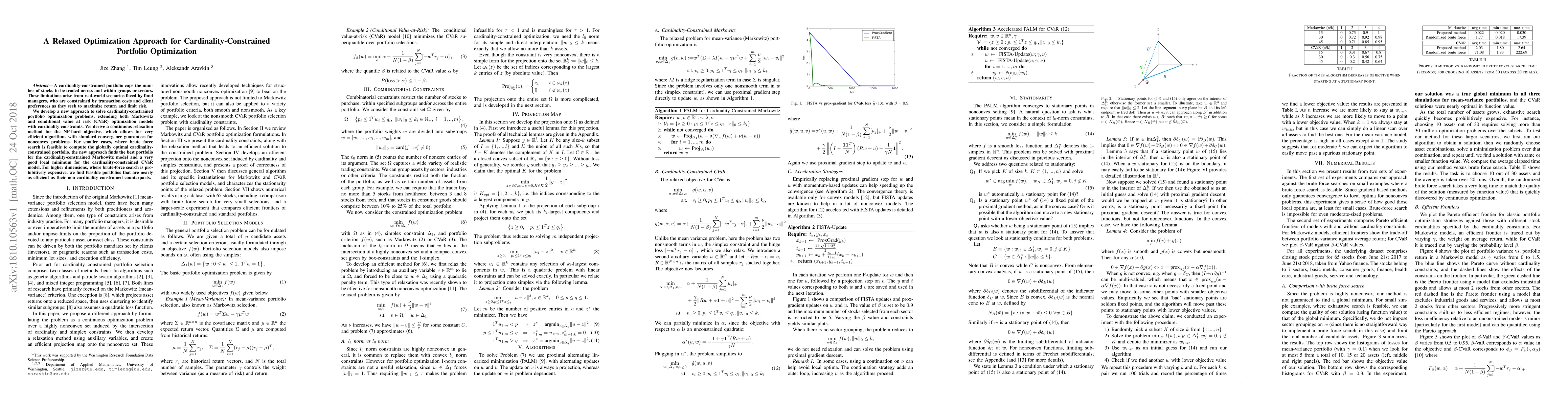 This paper proposes a relaxed optimization method to solve cardinality-constrained portfolio optimization problems, extending Markowitz and CVaR models. The approach efficiently finds near-optimal portfolios by deriving a continuous relaxation for the NP-hard problem.