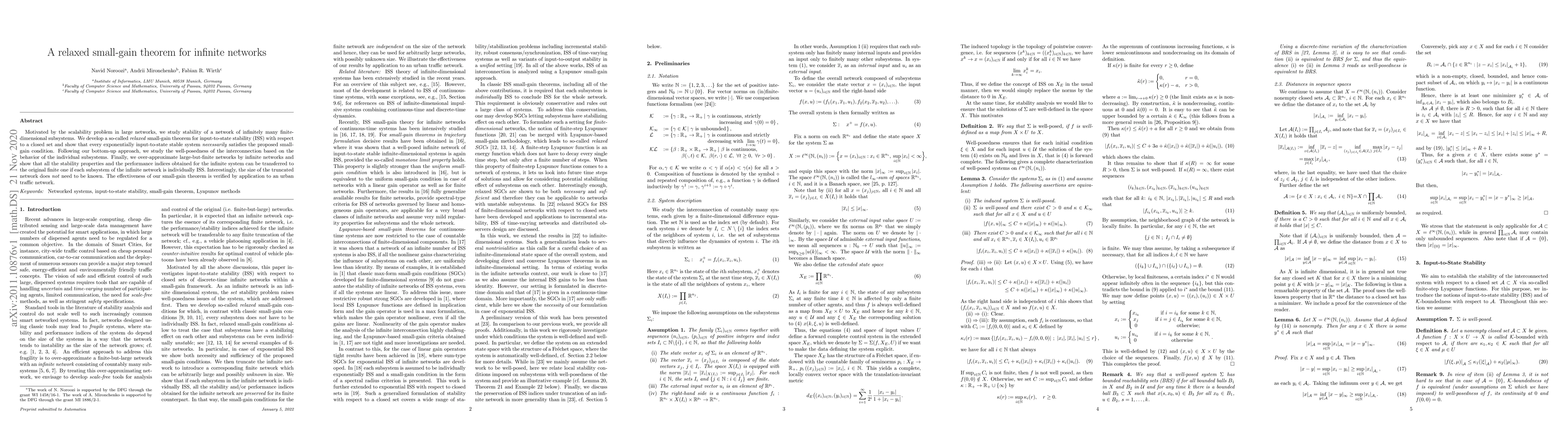 This paper proposes a relaxed small-gain theorem for infinite networks to address scalability issues, demonstrating that exponentially input-to-state stable systems satisfy the small-gain condition. It shows stability transfer from infinite to finite networks without requiring knowledge of the size of the truncated network, validated through an urban traffic network application.