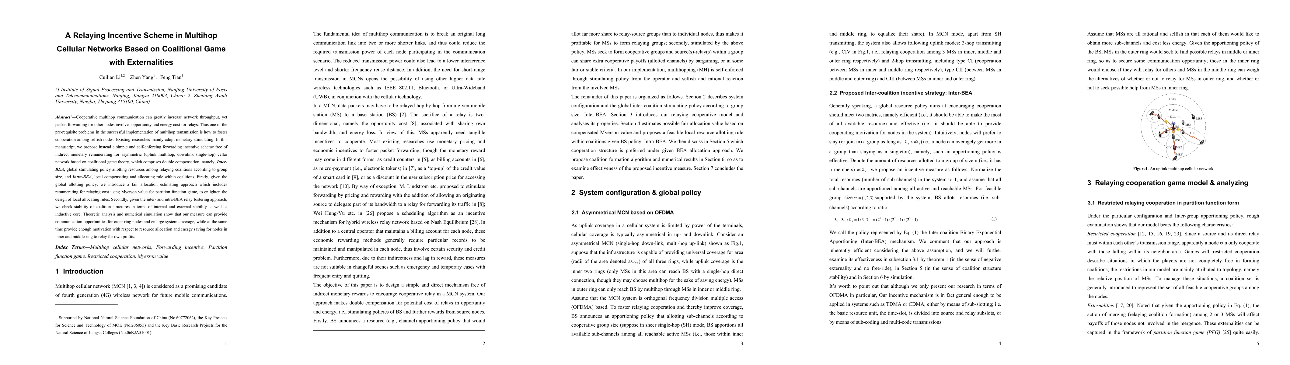 Cooperative multihop communication can greatly increase network throughput, yet packet forwarding for other nodes involves opportunity and energy cost for relays. Thus one of the pre-requisite problems in the successful implementation of multihop transmission is how to foster cooperation among selfish nodes. Existing researches mainly adopt monetary stimulating. In this manuscript, we propose instead a simple and self-enforcing forwarding incentive scheme free of indirect monetary remunerating for asymmetric (uplink multihop, downlink single-hop) cellar network based on coalitional game theory, which comprises double compensation, namely, Inter- BEA, global stimulating policy allotting resources among relaying coalitions according to group size, and Intra-BEA, local compensating and allocating rule within coalitions. Firstly, given the global allotting policy, we introduce a fair allocation estimating approach which includes remunerating for relaying cost using Myerson value for partition function game, to enlighten the design of local allocating rules. Secondly, given the inter- and intra-BEA relay fostering approach, we check stability of coalition structures in terms of internal and external stability as well as inductive core. Theoretic analysis and numerical simulation show that our measure can provide communication opportunities for outer ring nodes and enlarge system coverage, while at the same time provide enough motivation with respect to resource allocation and energy saving for nodes in inner and middle ring to relay for own profits.