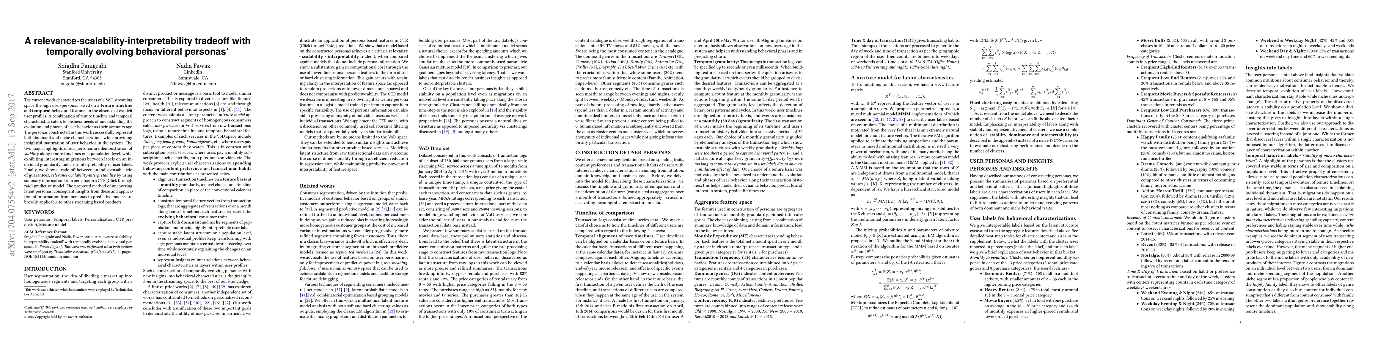 This research paper explores how to represent user behavior in a streaming space using personas that balance stability and individual variability, while also improving predictive models through summary information from these personas. The findings highlight the trade-off between relevance, scalability, and interpretability of these personas in understanding user behavior.