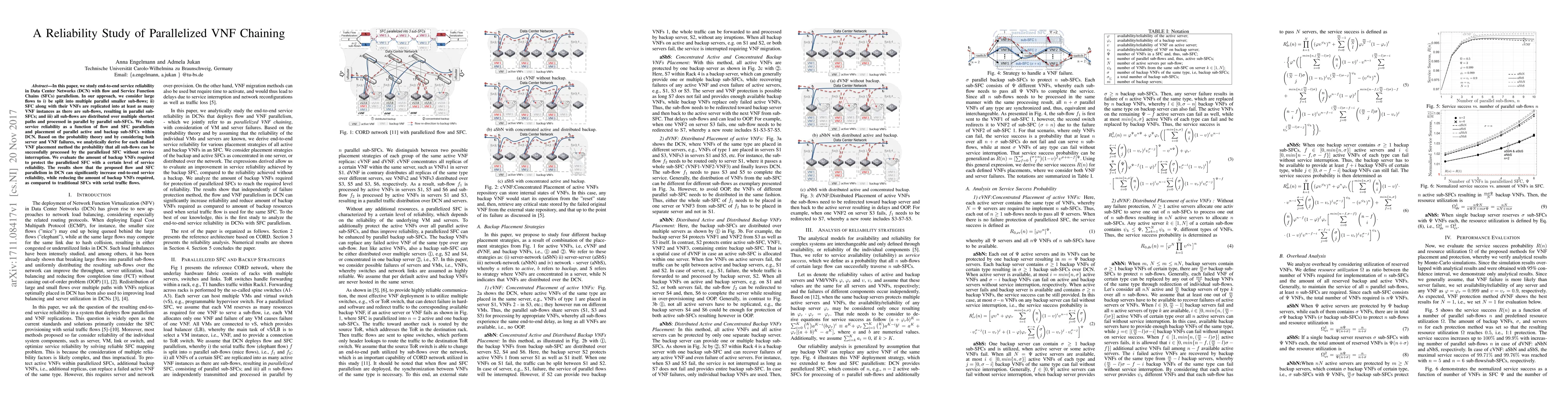In this paper, we study end-to-end service reliability in Data Center Networks (DCN) with flow and Service Function Chains (SFCs) parallelism. In our approach, we consider large flows to i) be split into multiple parallel smaller sub-flows; ii) SFC along with their VNFs are replicated into at least as many VNF instances as there are sub-flows, resulting in parallel sub-SFCs; and iii) all sub-flows are distributed over multiple shortest paths and processed in parallel by parallel sub-SFCs. We study service reliability as a function of flow and SFC parallelism and placement of parallel active and backup sub-SFCs within DCN. Based on the probability theory and by considering both server and VNF failures, we analytically derive for each studied VNF placement method the probability that all sub-flows can be successfully processed by the parallelized SFC without service interruption. We evaluate the amount of backup VNFs required to protect the parallelized SFC with a certain level of service reliability. The results show that the proposed flow and SFC parallelism in DCN can significantly increase end-to-end service reliability, while reducing the amount of backup VNFs required, as compared to traditional SFCs with serial traffic flows.