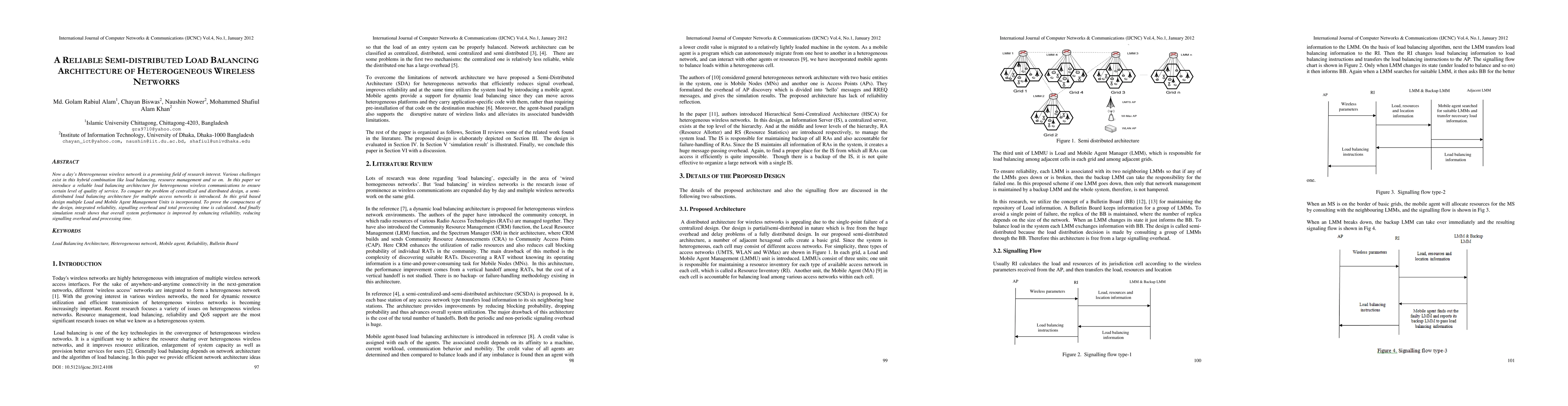 Now a day's Heterogeneous wireless network is a promising field of research interest. Various challenges exist in this hybrid combination like load balancing, resource management and so on. In this paper we introduce a reliable load balancing architecture for heterogeneous wireless communications to ensure certain level of quality of service. To conquer the problem of centralized and distributed design, a semi distributed load balancing architecture for multiple access networks is introduced. In this grid based design multiple Load and Mobile Agent Management Units is incorporated. To prove the compactness of the design, integrated reliability, signalling overhead and total processing time is calculated. And finally simulation result shows that overall system performance is improved by enhancing reliability, reducing signalling overhead and processing time.