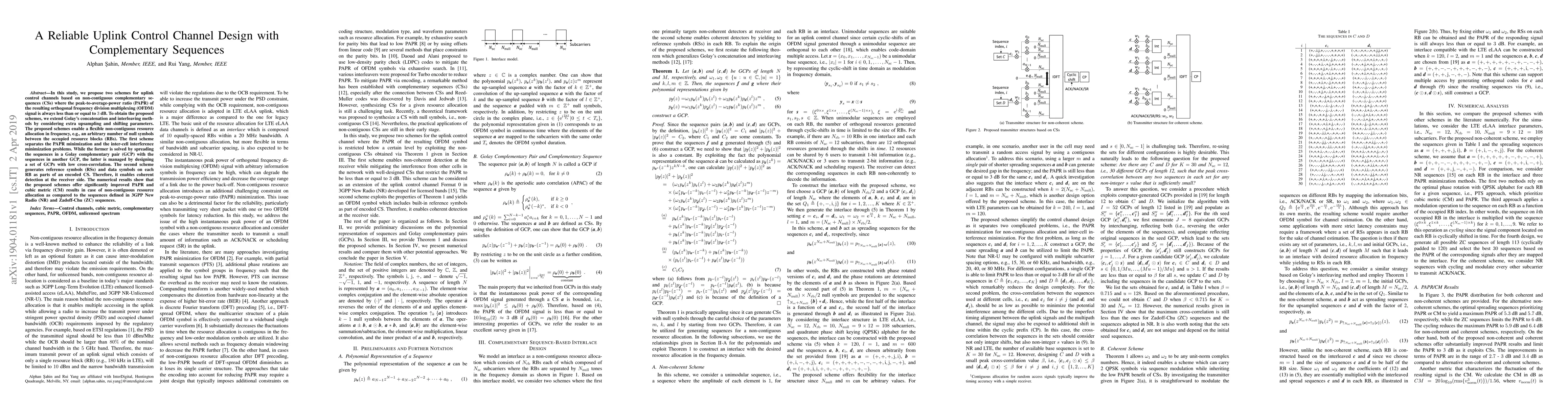 In this study, we propose two schemes for uplink control channels based on non-contiguous complementary sequences (CSs) where the peak-to-average-power ratio (PAPR) of the resulting orthogonal frequency division multiplexing (OFDM) signal is always less than or equal to 3 dB. To obtain the proposed schemes, we extend Golay's concatenation and interleaving methods by considering extra upsampling and shifting parameters. The proposed schemes enable a flexible non-contiguous resource allocation in frequency, e.g., an arbitrary number of null symbols between the occupied resource blocks (RBs). The first scheme separates the PAPR minimization and the inter-cell interference minimization problems. While the former is solved by spreading the sequences in a Golay complementary pair (GCP) with the sequences in another GCP, the latter is managed by designing a set of GCPs with low cross-correlation. The second scheme generates reference symbols (RSs) and data symbols on each RB as parts of an encoded CS. Therefore, it enables coherent detection at the receiver side. The numerical results show that the proposed schemes offer significantly improved PAPR and cubic metric (CM) results in case of non-contiguous resource allocation as compared to the sequences defined in 3GPP New Radio (NR) and Zadoff-Chu (ZC) sequences.