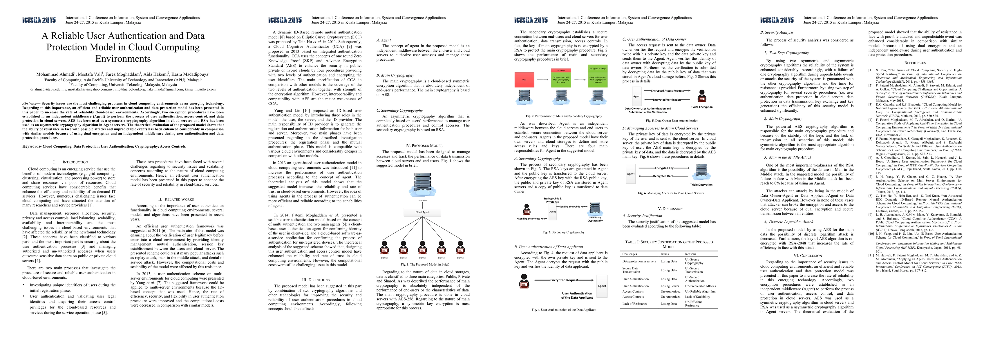Security issues are the most challenging problems in cloud computing environments as an emerging technology. Regarding to this importance, an efficient and reliable user authentication and data protection model has been presented in this paper to increase the rate of reliability cloud-based environments. Accordingly, two encryption procedures have been established in an independent middleware (Agent) to perform the process of user authentication, access control, and data protection in cloud servers. AES has been used as a symmetric cryptography algorithm in cloud servers and RSA has been used as an asymmetric cryptography algorithm in Agent servers. The theoretical evaluation of the proposed model shows that the ability of resistance in face with possible attacks and unpredictable events has been enhanced considerably in comparison with similar models because of using dual encryption and an independent middleware during user authentication and data protection procedures.