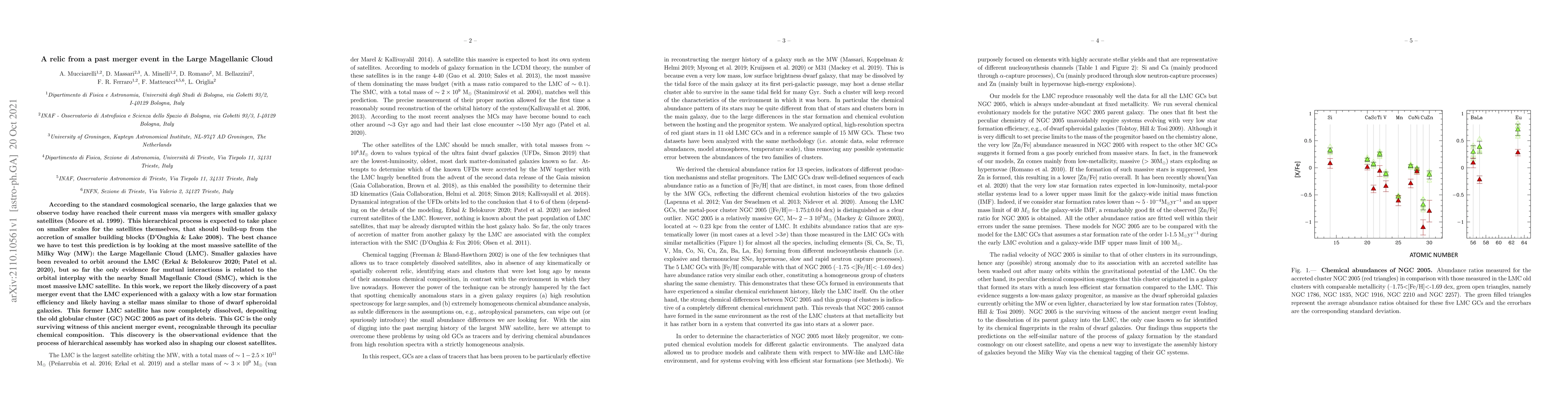 According to the standard cosmological scenario, the large galaxies that we observe today have reached their current mass via mergers with smaller galaxy satellites (Moore et al.1999). This hierarchical process is expected to take place on smaller scales for the satellites themselves, that should build-up from the accretion of smaller building blocks (D'Onghia & Lake 2008). The best chance we have to test this prediction is by looking at the most massive satellite of the Milky Way (MW): the Large Magellanic Cloud (LMC). Smaller galaxies have been revealed to orbit around the LMC (Erkal & Belokurov 2020, Patel et al. 2020), but so far the only evidence for mutual interactions is related to the orbital interplay with the nearby Small Magellanic Cloud (SMC), which is the most massive LMC satellite. In this work, we report the likely discovery of a past merger event that the LMC experienced with a galaxy with a low star formation efficiency and likely having a stellar mass similar to those of dwarf spheroidal galaxies. This former LMC satellite has now completely dissolved, depositing the old globular cluster (GC) NGC 2005 as part of its debris. This GC is the only surviving witness of this ancient merger event, recognizable through its peculiar chemical composition. This discovery is the observational evidence that the process of hierarchical assembly has worked also in shaping our closest satellites.