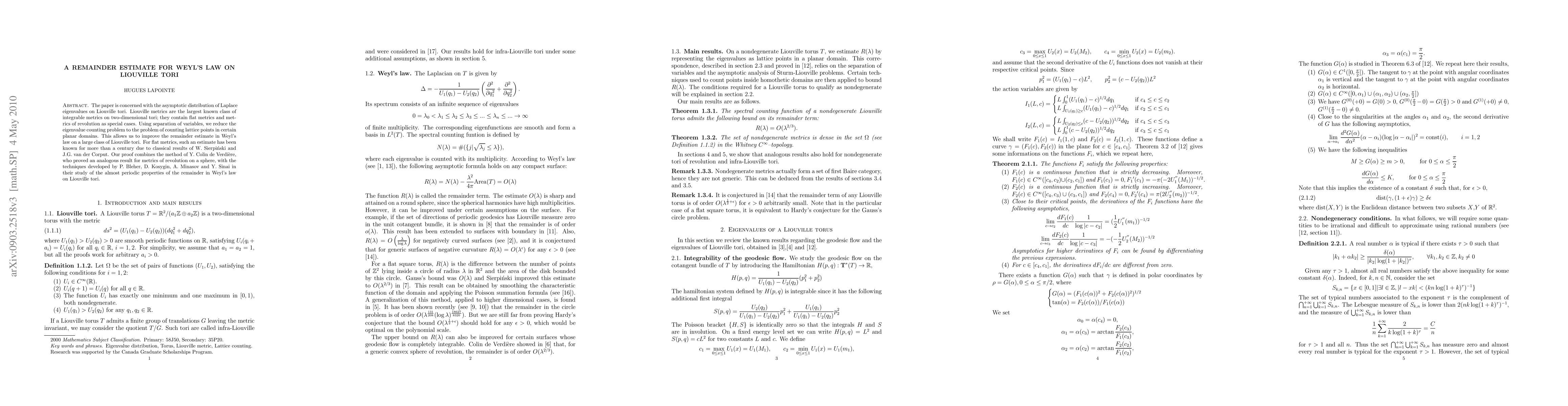 The paper presents a novel approach to estimating the remainder term in Weyl's law for Liouville tori, combining analytic techniques with number-theoretic insights.