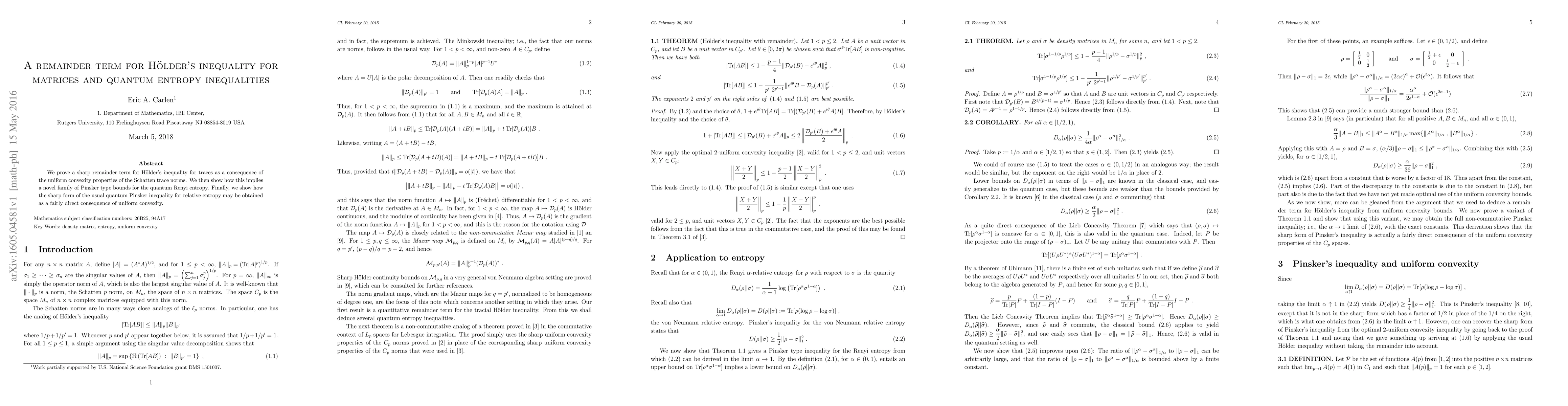 This paper establishes a sharp remainder term for H\"older's inequality for matrix traces, leveraging uniform convexity of Schatten trace norms. It further derives novel Pinsker type bounds for quantum Renyi entropy and a refined quantum Pinsker inequality for relative entropy.