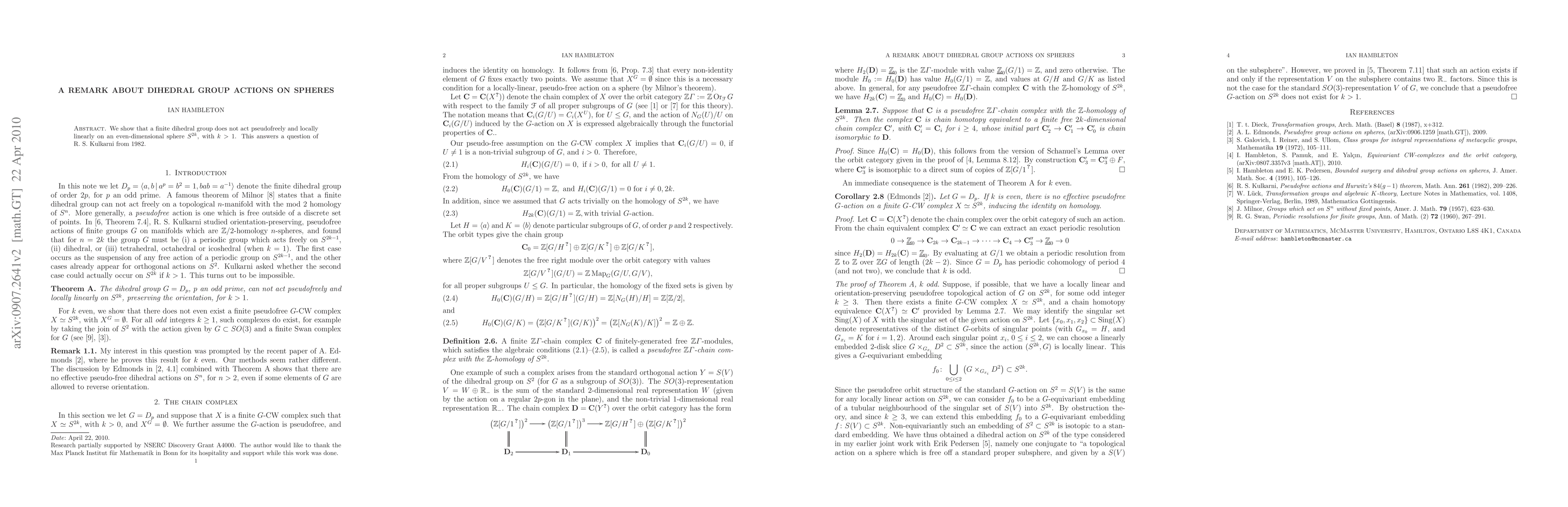We show that a finite dihedral group does not act pseudofreely and locally linearly on a 2k-dimensional sphere, if k > 1. This answers a question of R. S. Kulkarni from 1982.
