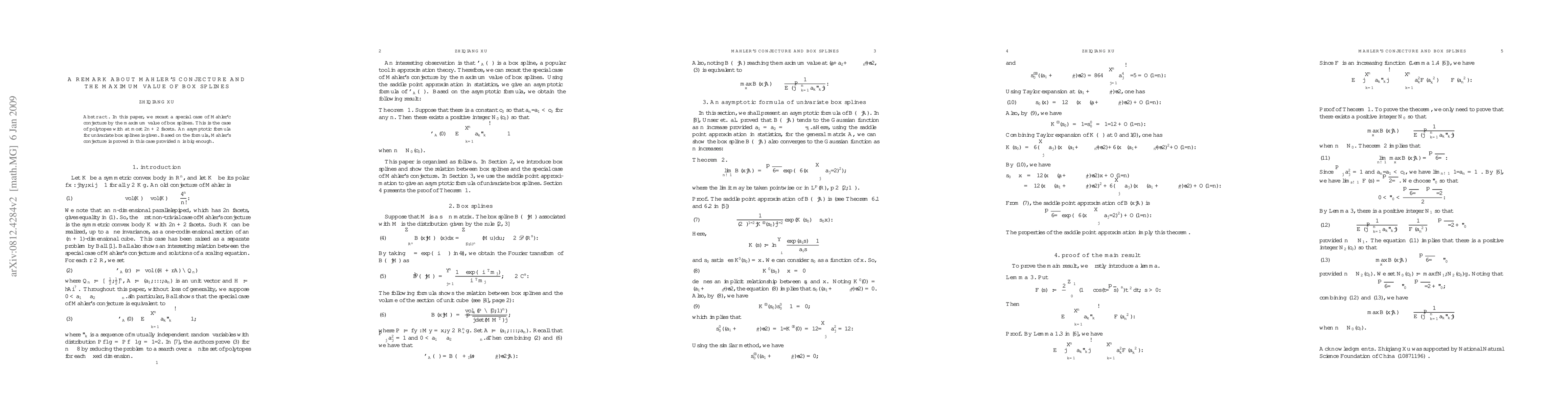 In this paper, we recast a special case of Mahler'c conjecture by the maximum value of box splines. This is the case of polytopes with at most $2n+2$ facets. An asymptotic formula for univariate box splines is given. Based on the formula, Mahler's conjecture is proved in this case provided $n$ is big enough.