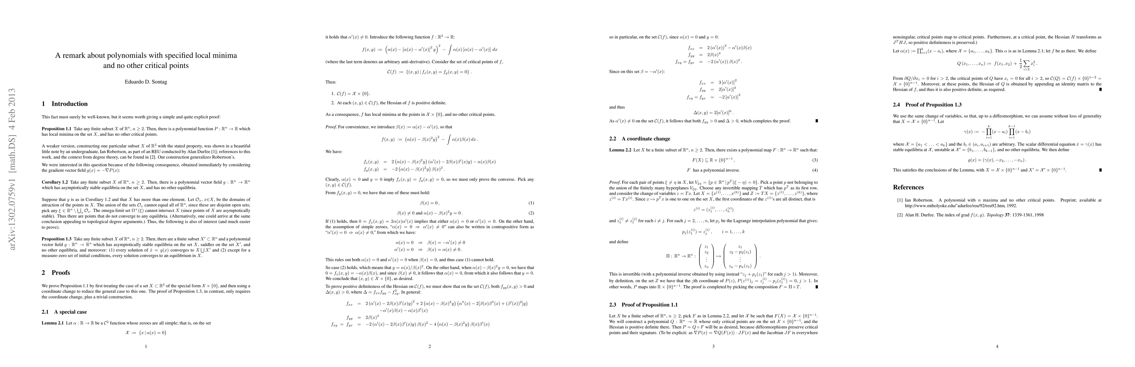 The following observation must surely be "well-known", but it seems worth giving a simple and quite explicit proof. Take any finite subset X of Rn, n>1. Then, there is a polynomial function P:Rn -> R which has local minima on the set X, and has no other critical points. Applied to the negative gradient flow of P, this implies that there is a polynomial vector field with asymptotically stable equilibria on X and no other equilibria. Some trajectories of this vector field are not pre-compact; a complementary observation says that, again for arbitrary X, one can find a vector field with asymptotically stable equilibria on X, no other equilibria except saddles, and all omega-limit sets consisting of singletons.