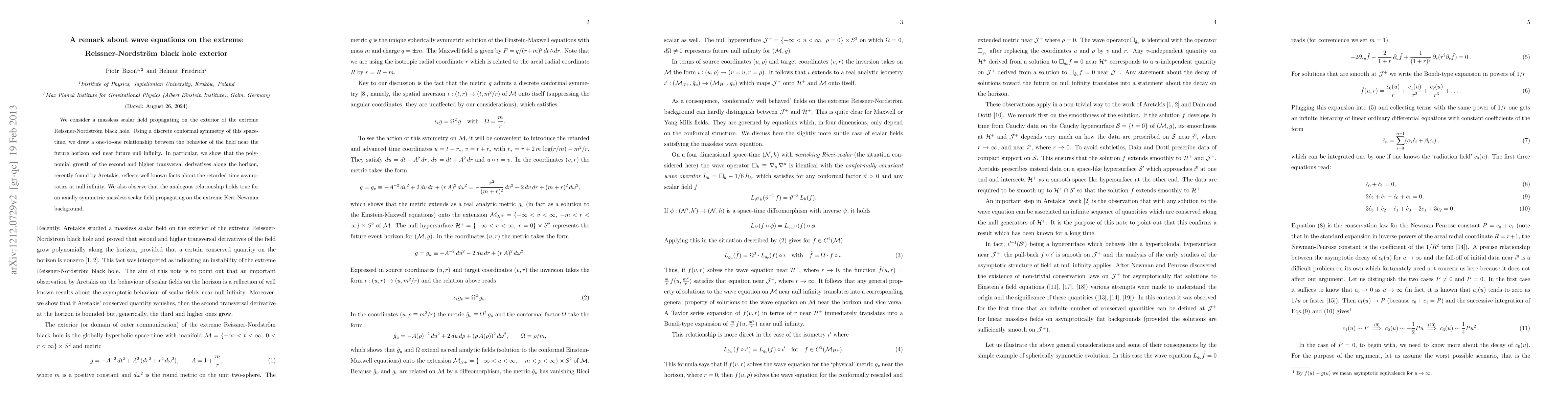 We consider a massless scalar field propagating on the exterior of the extreme Reissner-Nordstr\"om black hole. Using a discrete conformal symmetry of this spacetime, we draw a one-to-one relationship between the behavior of the field near the future horizon and near future null infinity. In particular, we show that the polynomial growth of the second and higher transversal derivatives along the horizon, recently found by Aretakis, reflects well known facts about the retarded time asymptotics at null infinity.
