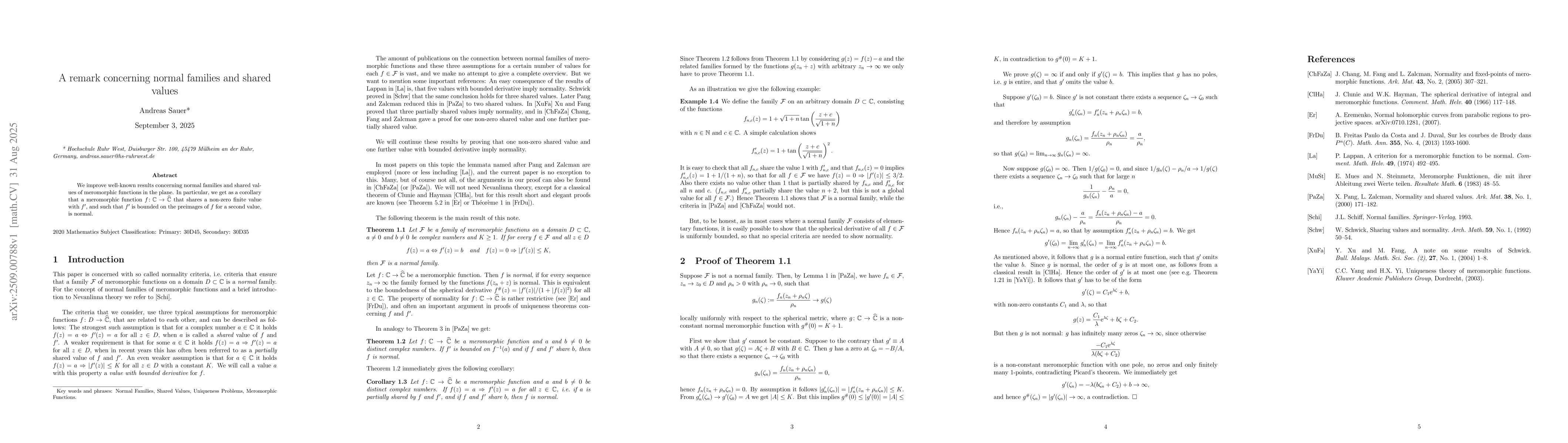 We improve well-known results concerning normal families and shared values of meromorphic functions in the plane. In particular, we get as a corollary that a meromorphic function $f \colon \C \to \Cd$ that shares a non-zero finite value with $f'$, and such that $f'$ is bounded on the preimages of $f$ for a second value, is normal.
